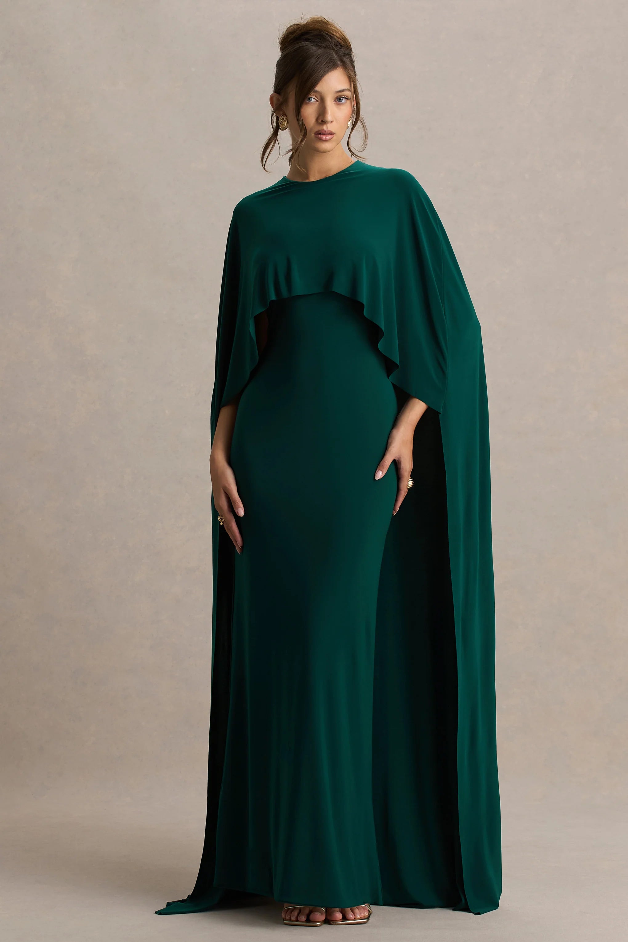 Captivate from all angles in Padma, our opulent green maxi dress. Crafted in a premium stretch jersey, Padma sculpts your frame with a flattering bodycon fit. Defined by floor length cape sleeves that command attention, try styling yours with a sleek bun and our Sanya earrings for the ultimate occasion look.