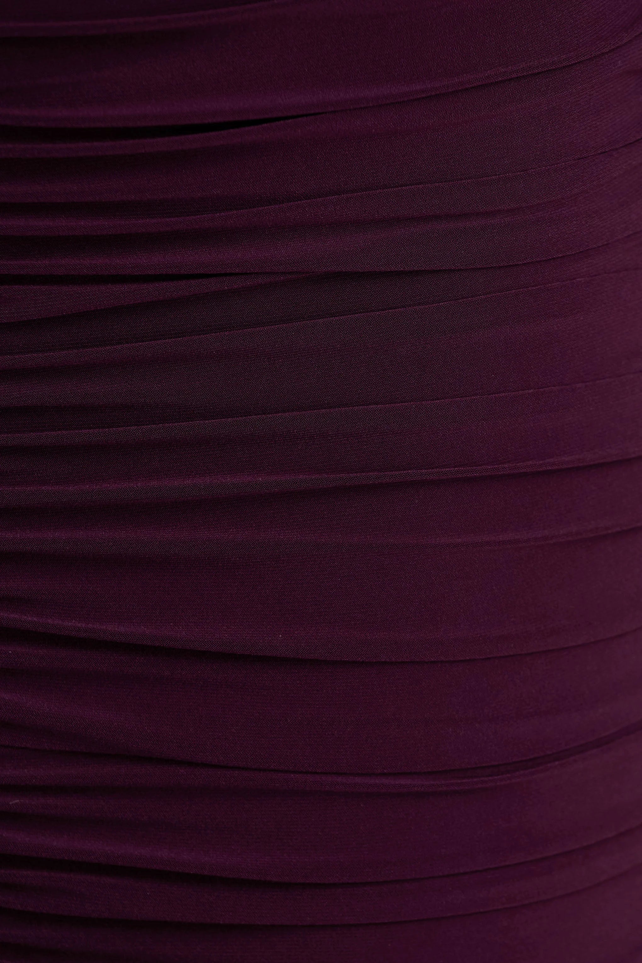 Turns heads this season in our latest maxi Pasqualina. Carefully crafted in a gorgeous plum hue of our premium jersey, this piece showcases a striking modern silhouette which transforms seamlessly from a plunge neckline to a ruched bodice, finished with a mesh skirt. Perfect for sunset dinner dates, pair yours with dainty details to embrace your femininity.
