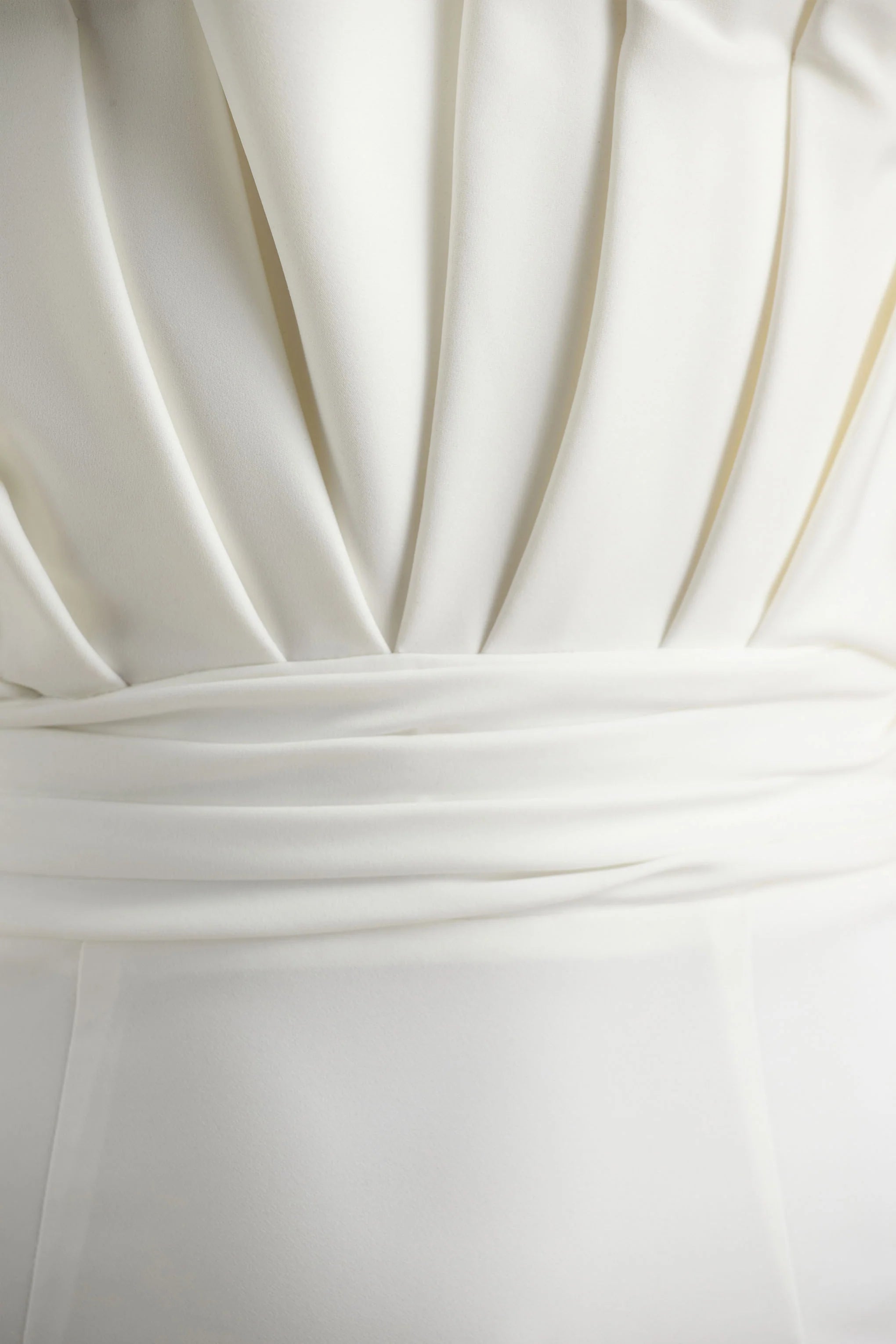 Command attention and make a striking entrance in Pastoral. Designed in a crisp white hue of our premium crepe, this mini dress turns heads in every room. Boasting a ruffled bodice that brings elegant drama to every moment, in this dress you will be photo ready from all angles. Pair with dainty jewellery and a chic up-do for a captivating evening look.