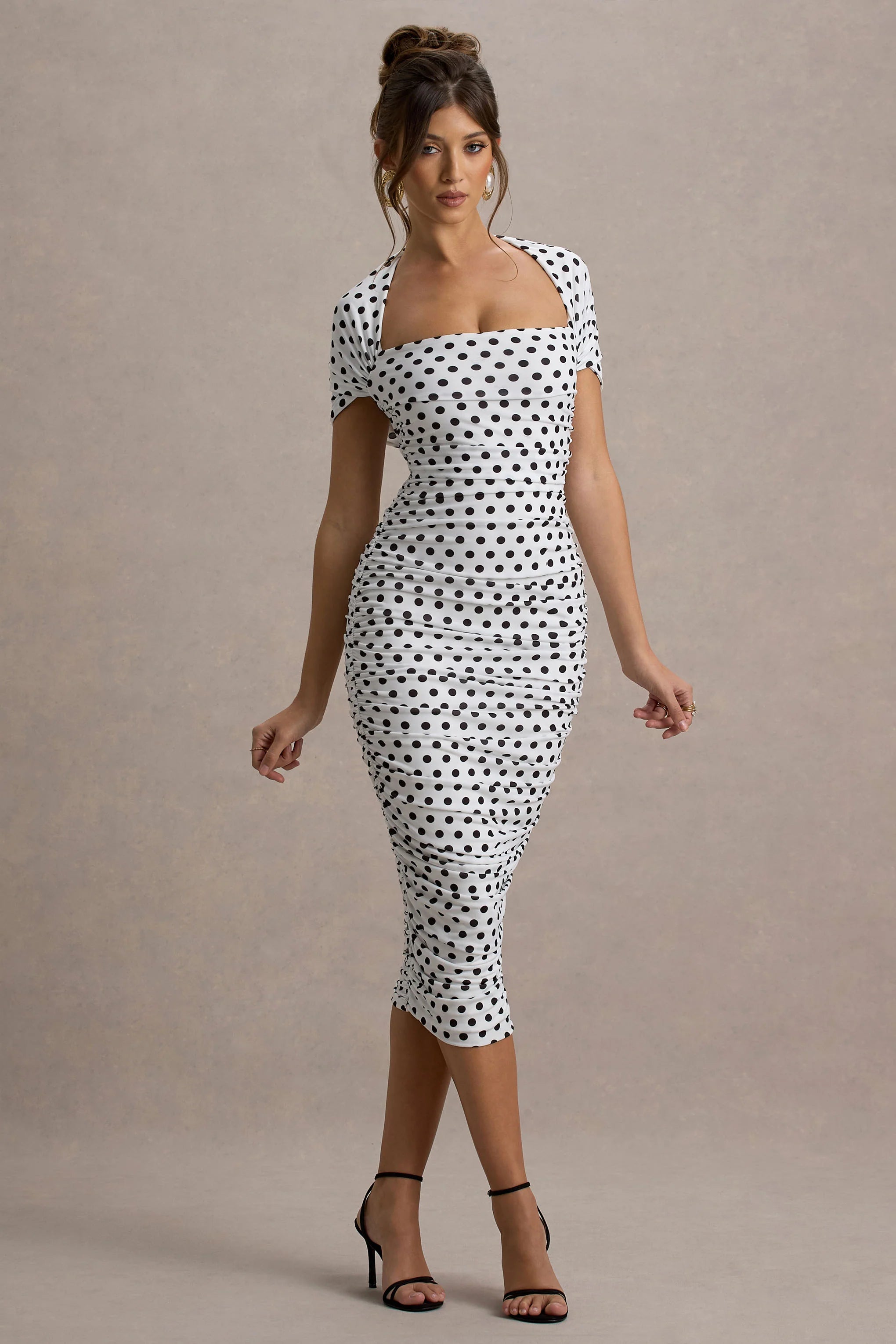 Every wardrobe needs a ruched midi dress and Paxos is the perfect choice. Expertly cut in a white polka dot print of our signature stretch jersey, with ruching to sculpt your figure. Paxos is detailed with short twisted sleeves and would look stunning styled with a tousled bun and some gold accents.