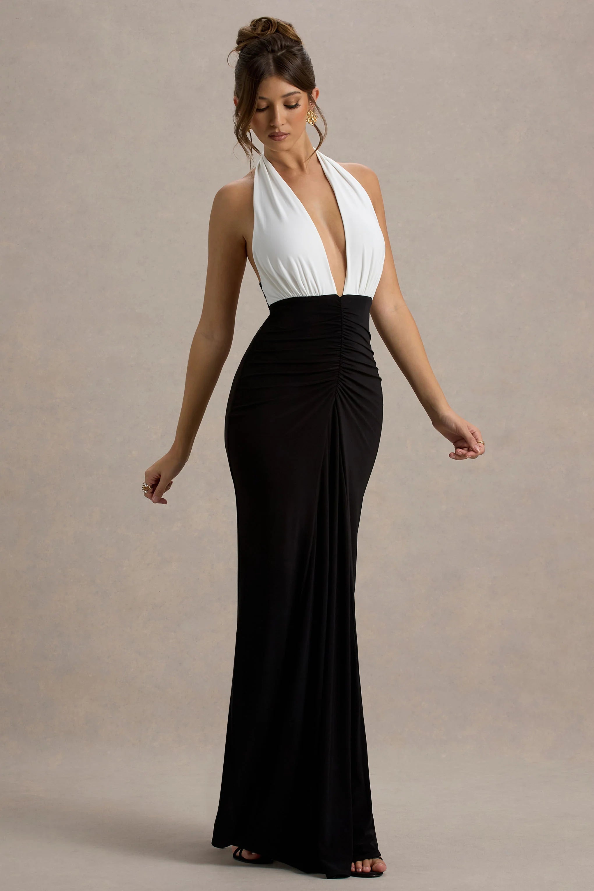 A simple modern silhouette that's perfect for the upcoming occasion season is Payton. Cut in black and white in our sculpting stretch jersey, this maxi dress is ruched in all the right places for an ultra flattering fit. Style Payton with a tousled bun to show off the elegant self-tie halter neck.