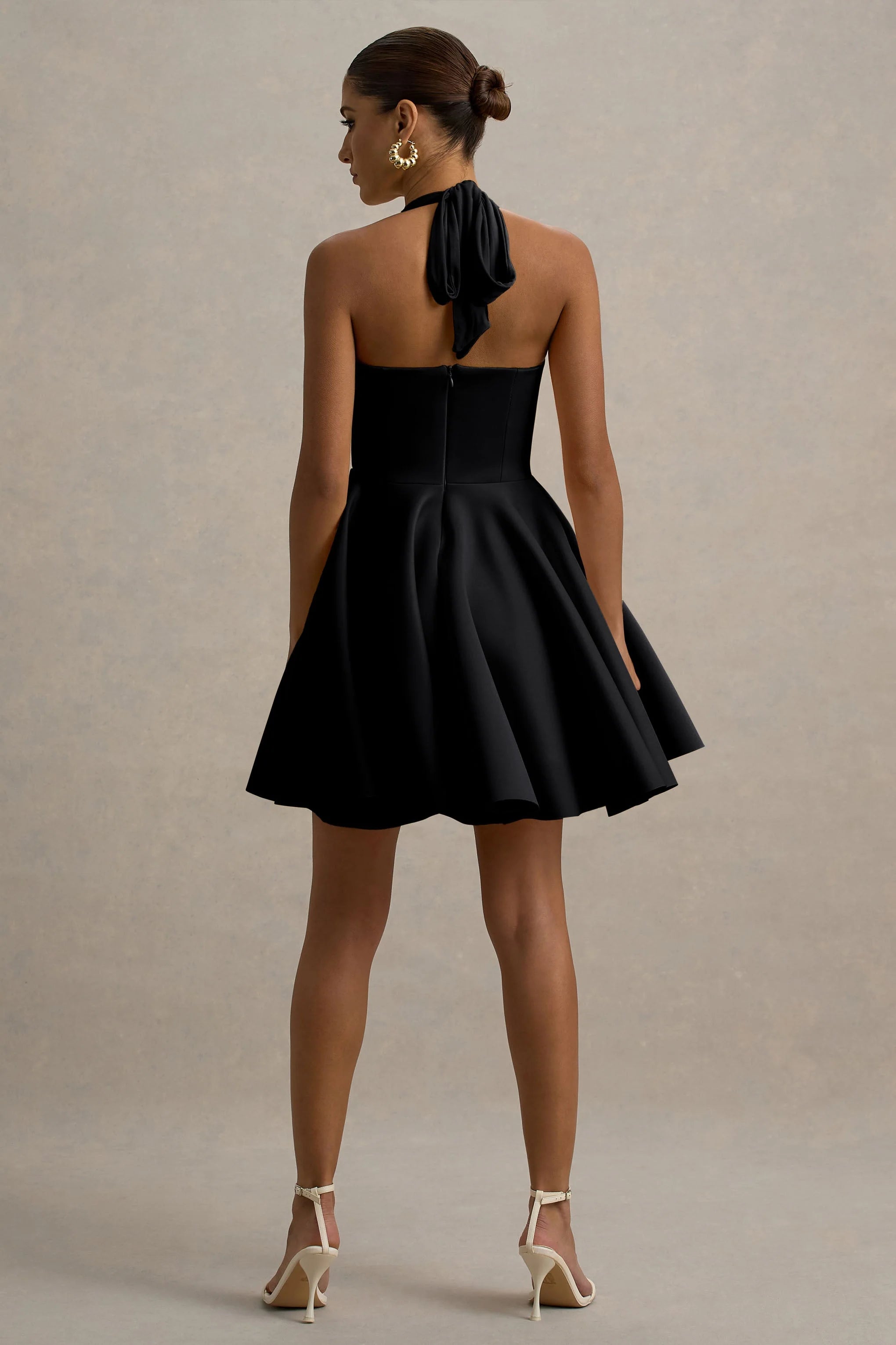 Effortlessly chic and undeniably lavish, Peggy is the must-have mini dress for those "I have nothing to wear" moments. Crafted in our premium black scuba and mesh, this gorgeous piece is decorated with a self tie halter neckline and a volume skater skirt for that ultimate feminine feel. Pair yours with our Sweet Step heeled sandals.