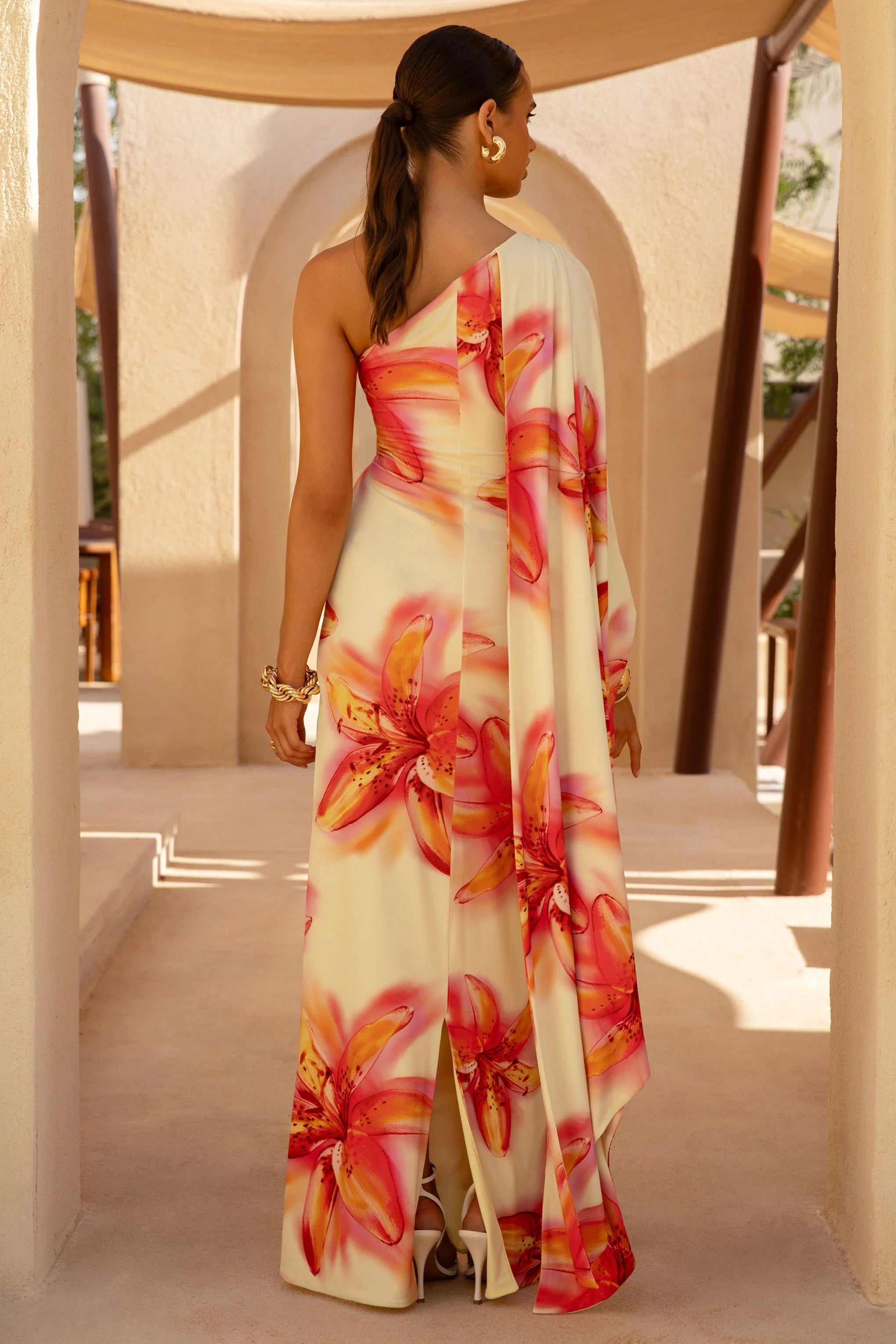 Introducing our latest show-stopper Portia, the statement style your summer lineup needs. Cut from our premium stretch jersey, in a fresh lemon lily print that radiates glamorous energy, in this maxi you will have all eyes on you. The asymmetric neckline and single draped sleeve bring a touch of drama, while the ruched detailing contours your curves in all the right places. Chic, bold, and undeniably glamorous, Portia is made for sunset soirees and summer celebrations.