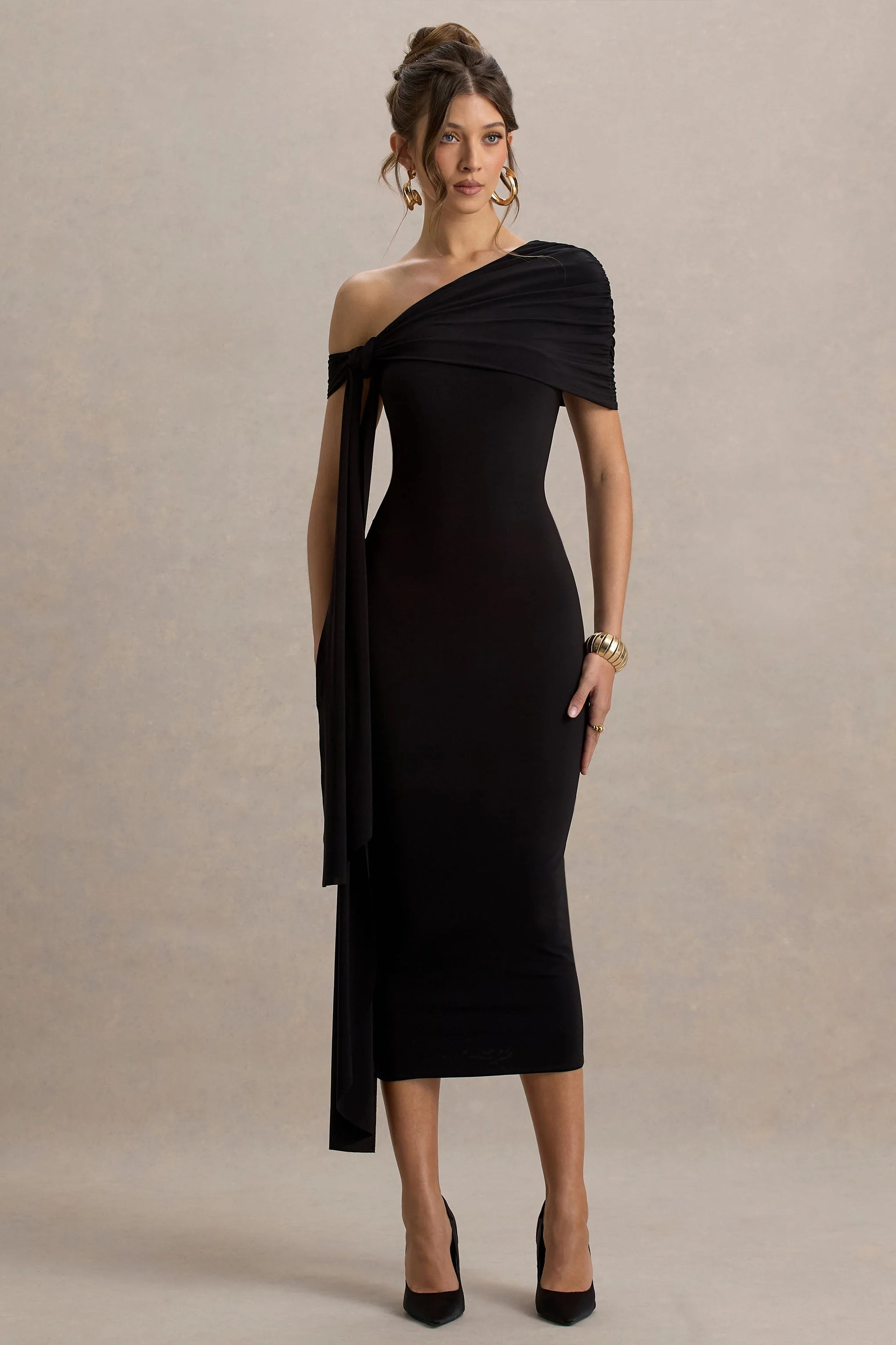 Striking in silhouette and rich in detail, Praia is the embodiment of contemporary elegance. Crafted from our premium stretch jersey in classic black, this midi dress is designed to contour the body while allowing ease and movement. Featuring an asymmetric neckline that's elevated with a beautifully draped, knotted overlay adding structure and softness in perfect balance. The sleek, minimalist silhouette is finished with a centre-back split for graceful movement, making Praia a powerful choice for elevated evenings or sophisticated events.