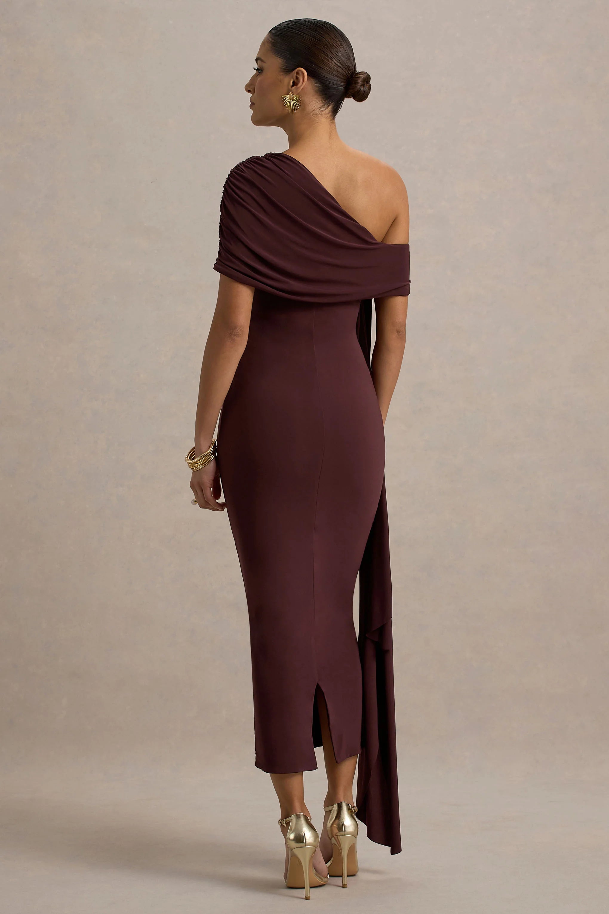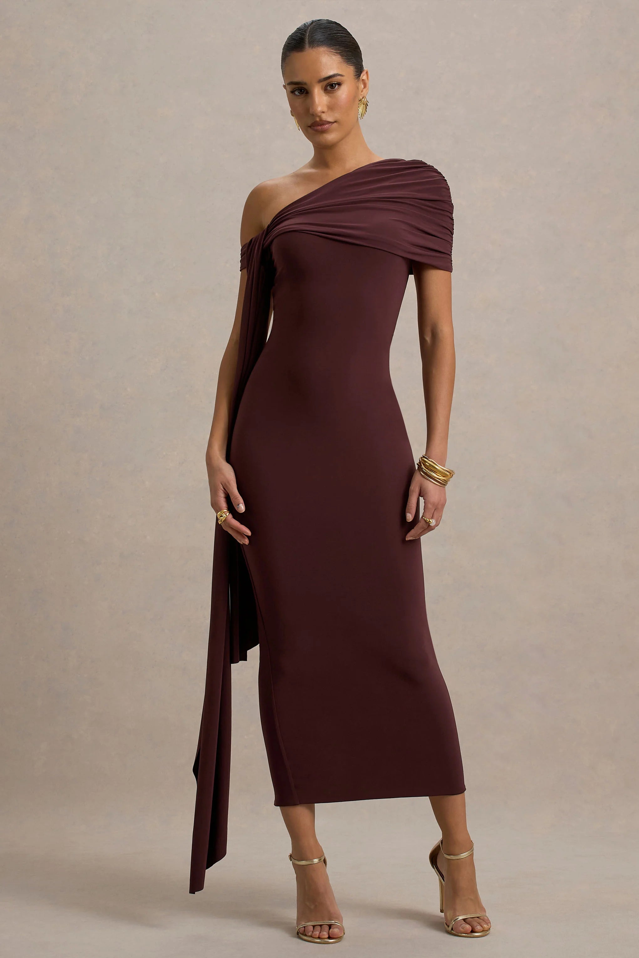 Striking in silhouette and rich in detail, Praia is the embodiment of contemporary elegance. Crafted from our premium stretch jersey in classic burgundy, this midi dress is designed to contour the body while allowing ease and movement. Featuring an asymmetric neckline that's elevated with a beautifully draped, knotted overlay adding structure and softness in perfect balance. The sleek, minimalist silhouette is finished with a centre-back split for graceful movement, making Praia a powerful choice for elevated evenings or sophisticated events.