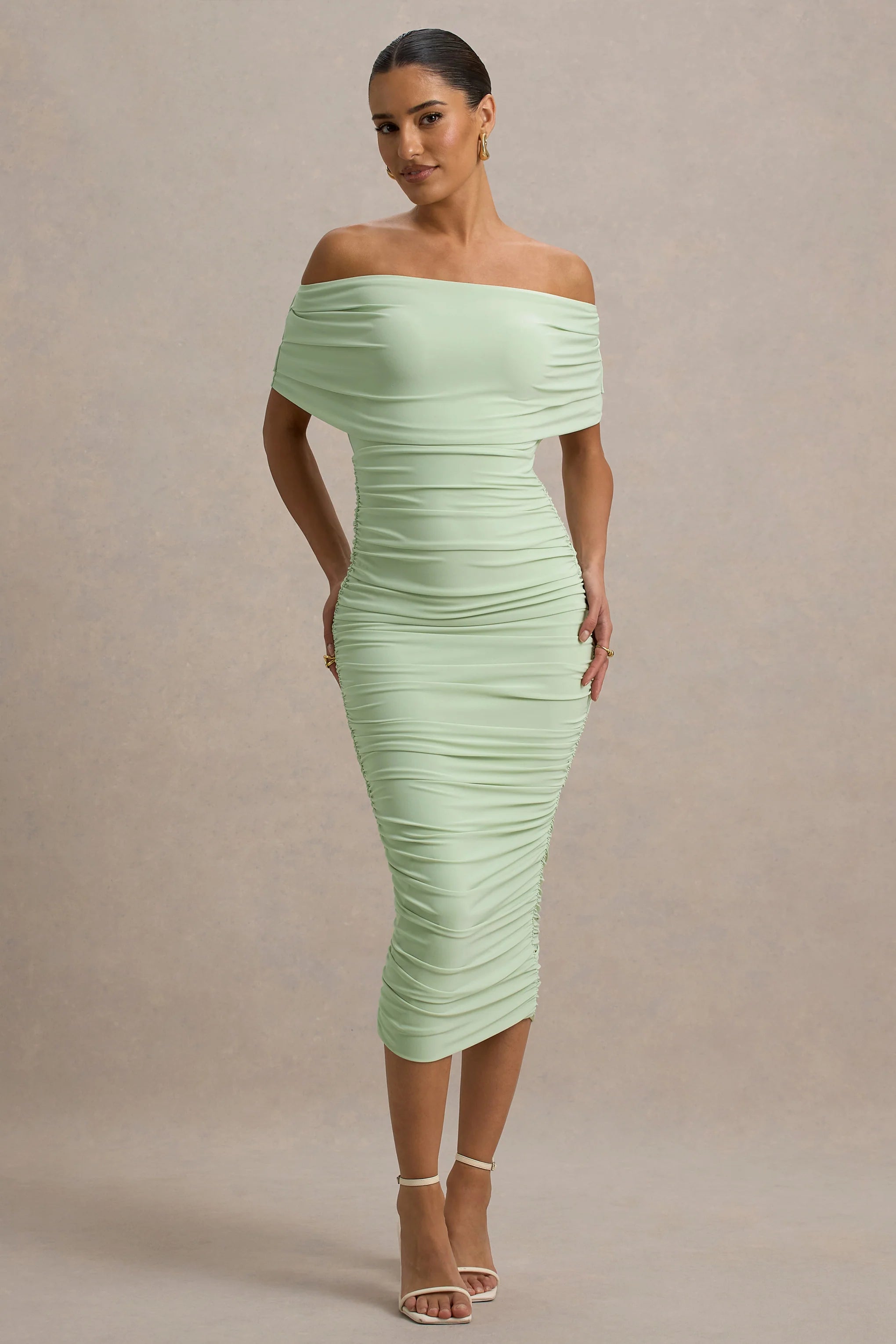When the occasion calls for the perfect midi dress, then Rayleigh is the standout answer. With trending ruched details and a beautiful bardot neckline, the light green premium stretch jersey comes to life, making every head turn in your direction.