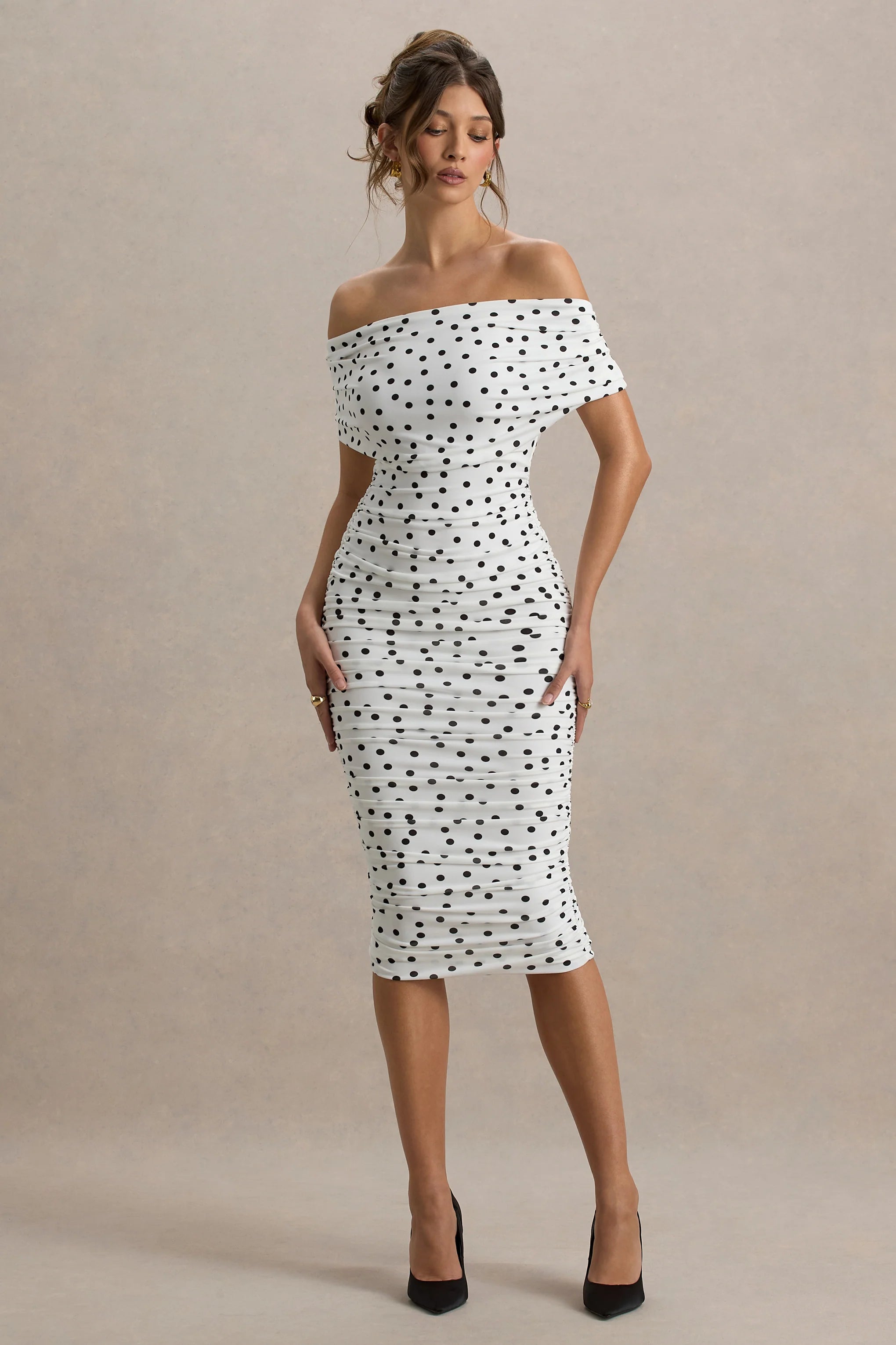 When the occasion calls for the perfect midi dress, then Rayleigh is the standout answer. With trending ruched details and a beautiful bardot neckline, the polka dot premium stretch jersey comes to life, making every head turn in your direction.