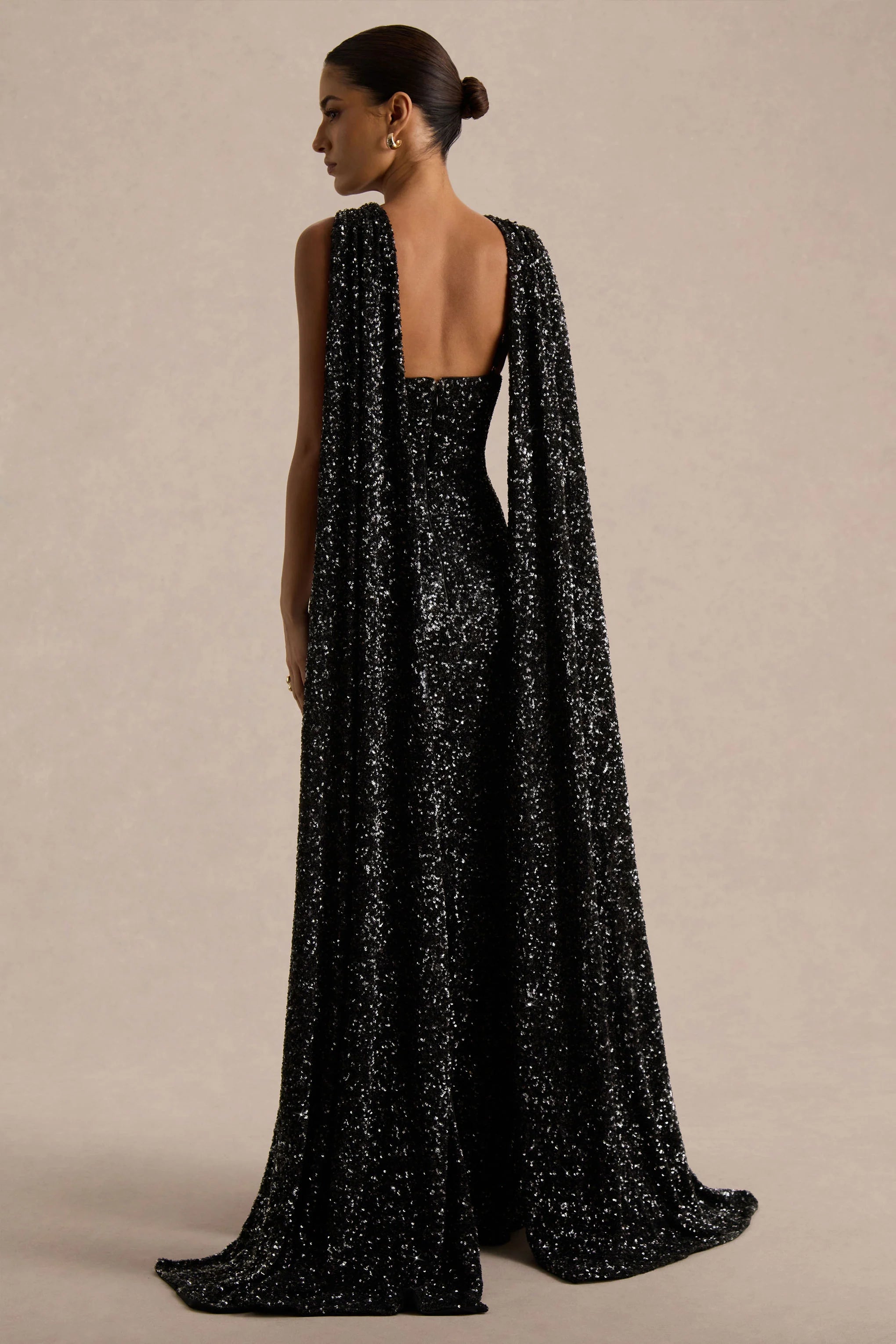 Shine from every angle in Renelle. Designed in our premium black sequins, this statement silhouette is made to captivate. Designed with a feminine, halter neckline that features a striking cut-out detail at the chest and a flowing back-sash that drapes with effortless elegance. Finished in a floor-sweeping maxi length, Renelle is made for after-dark moments that demand attention.