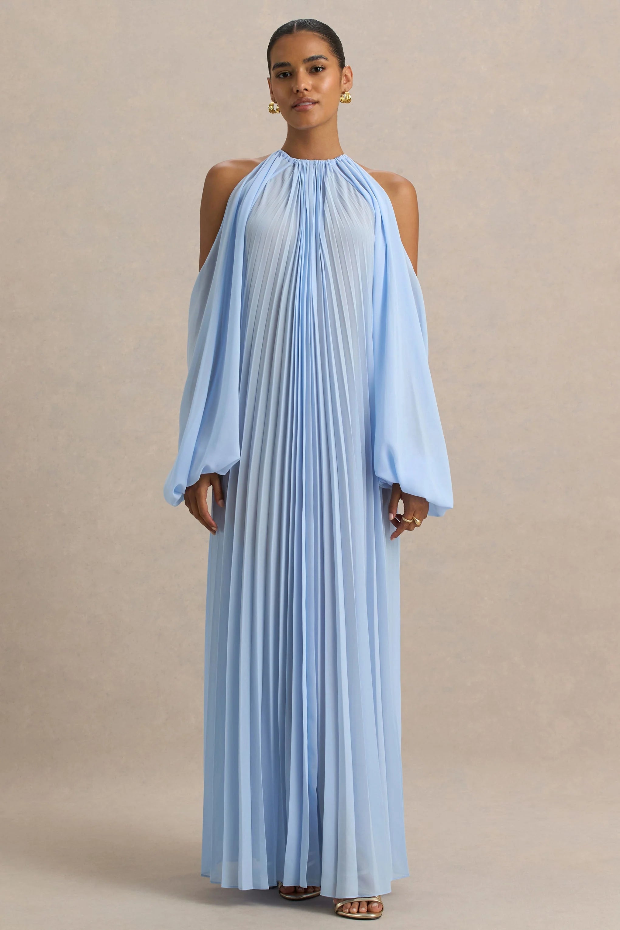 Make a statement in Reyna, our latest gown that defines ethereal elegance. Curated in a delicate powder blue shade of our premium pleated chiffon, this floor sweeping silhouette features a high neckline and dramatic cold shoulder cut-outs that elegantly frame you. Finished with a statement-making back cape, that cascades effortlessly over your silhouette. Romantic and refined, Reyna is made to turn heads. Style with sleek heels and a clutch bag for your next dressed up occasion.