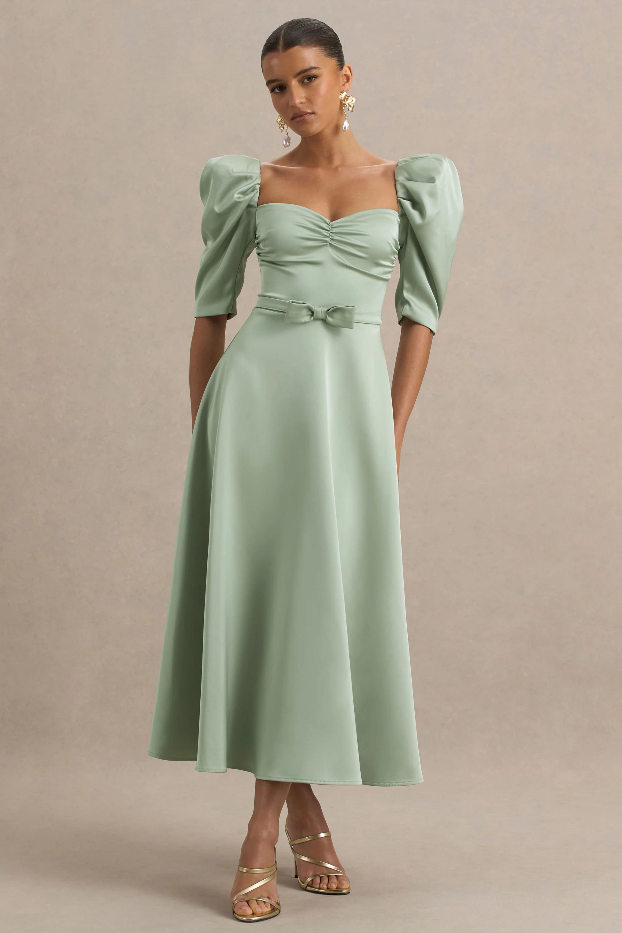 Become a vision of timeless elegance and allure in Rosey. This midi dress is cut from our premium stretch satin, in a stunning green hue, offering a flawless fit for any occasion. The sweetheart neckline adds a touch of soft femininity, while the structured sleeves provide drama and sophistication. Cinching the waist with a delicate bow detail, Rosey creates a sculpted silhouette that's effortlessly chic. Whether you're attending a wedding or a glamourous dinner, this showstopping piece ensures you make an unforgettable entrance.