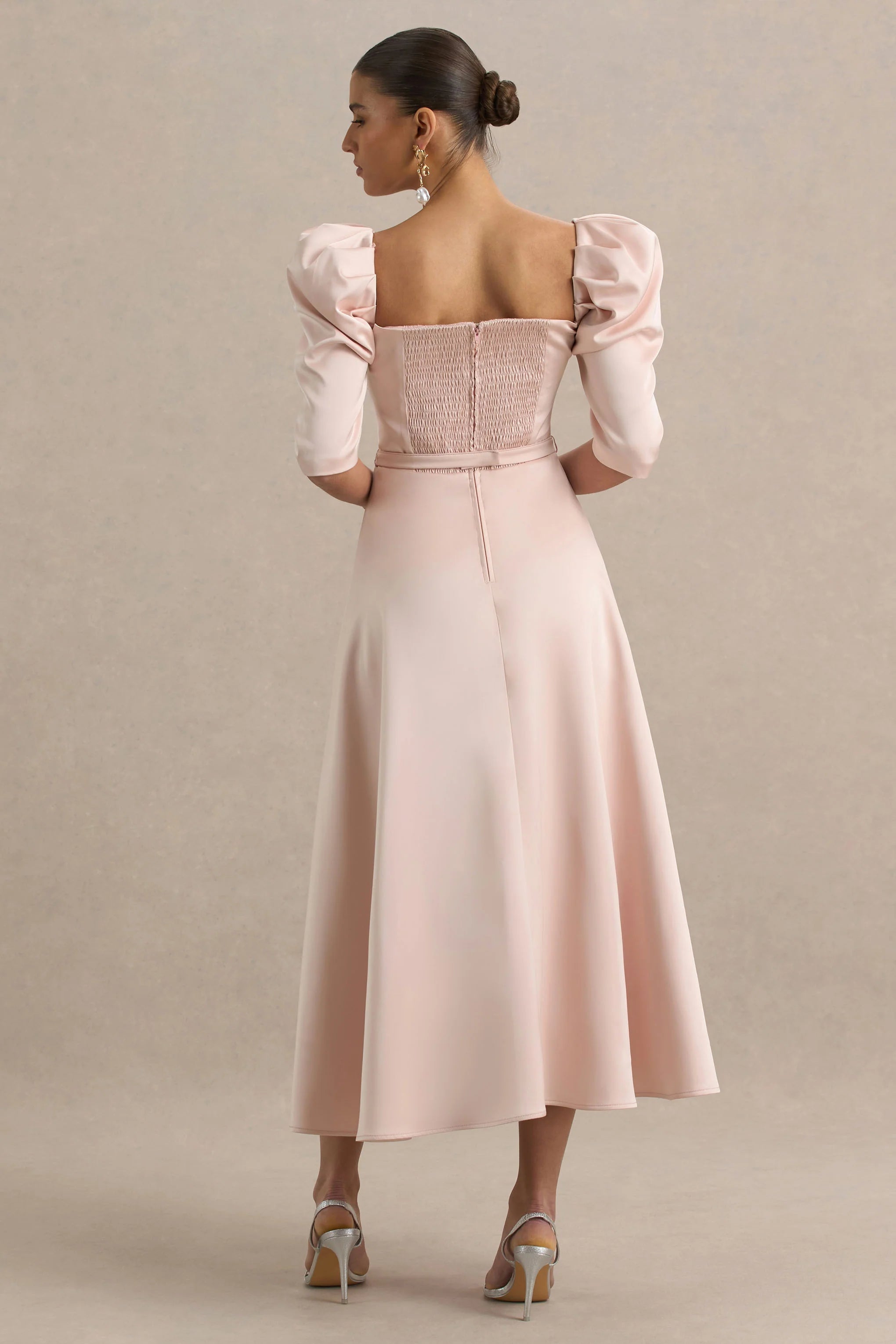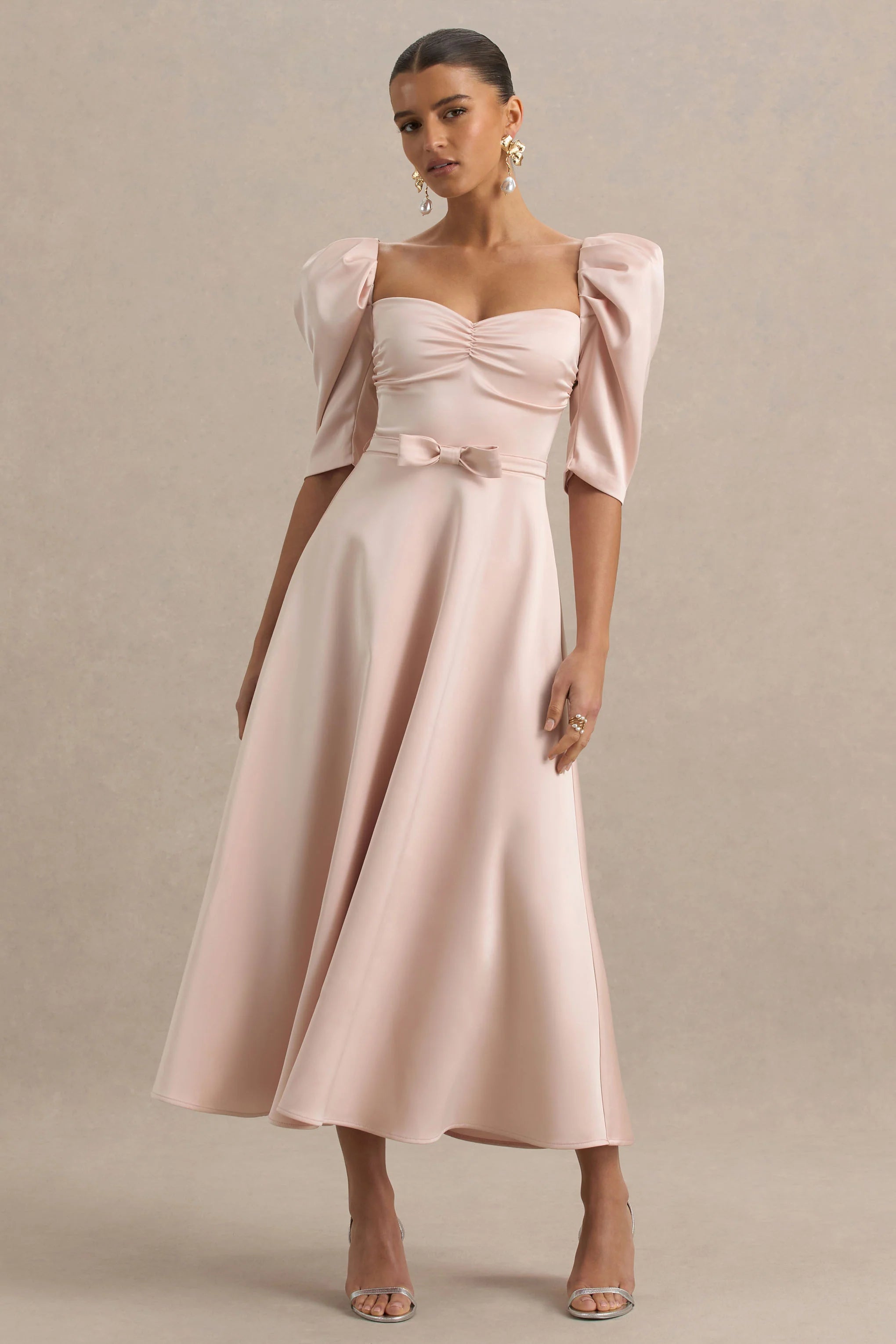 Become a vision of timeless elegance and allure in Rosey. This midi dress is cut from our premium stretch satin, in a stunning pale pink hue, offering a flawless fit for any occasion. The sweetheart neckline adds a touch of soft femininity, while the structured sleeves provide drama and sophistication. Cinching the waist with a delicate bow detail, Rosey creates a sculpted silhouette that's effortlessly chic. Whether you're attending a wedding or a glamourous dinner, this showstopping piece ensures you make an unforgettable entrance.