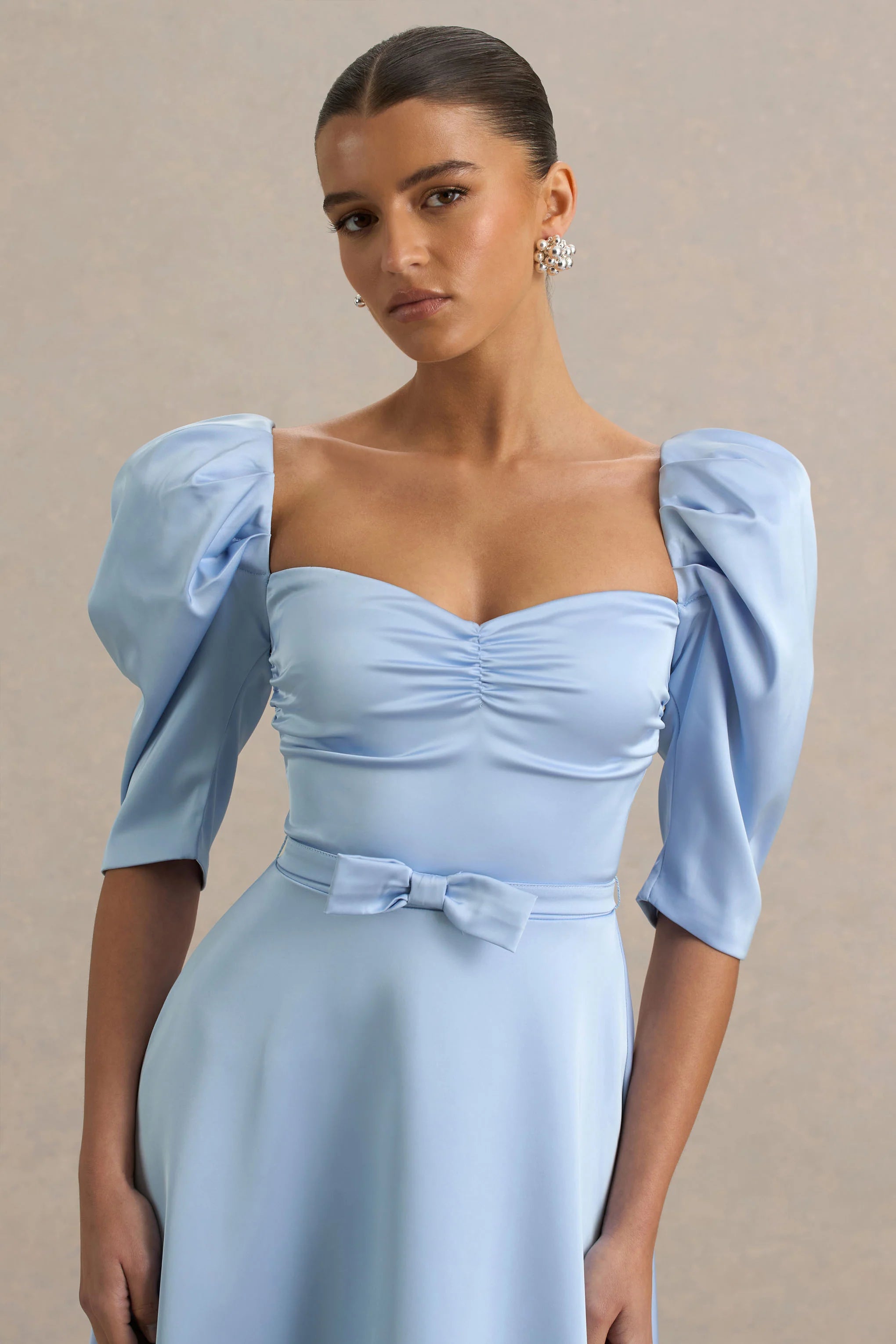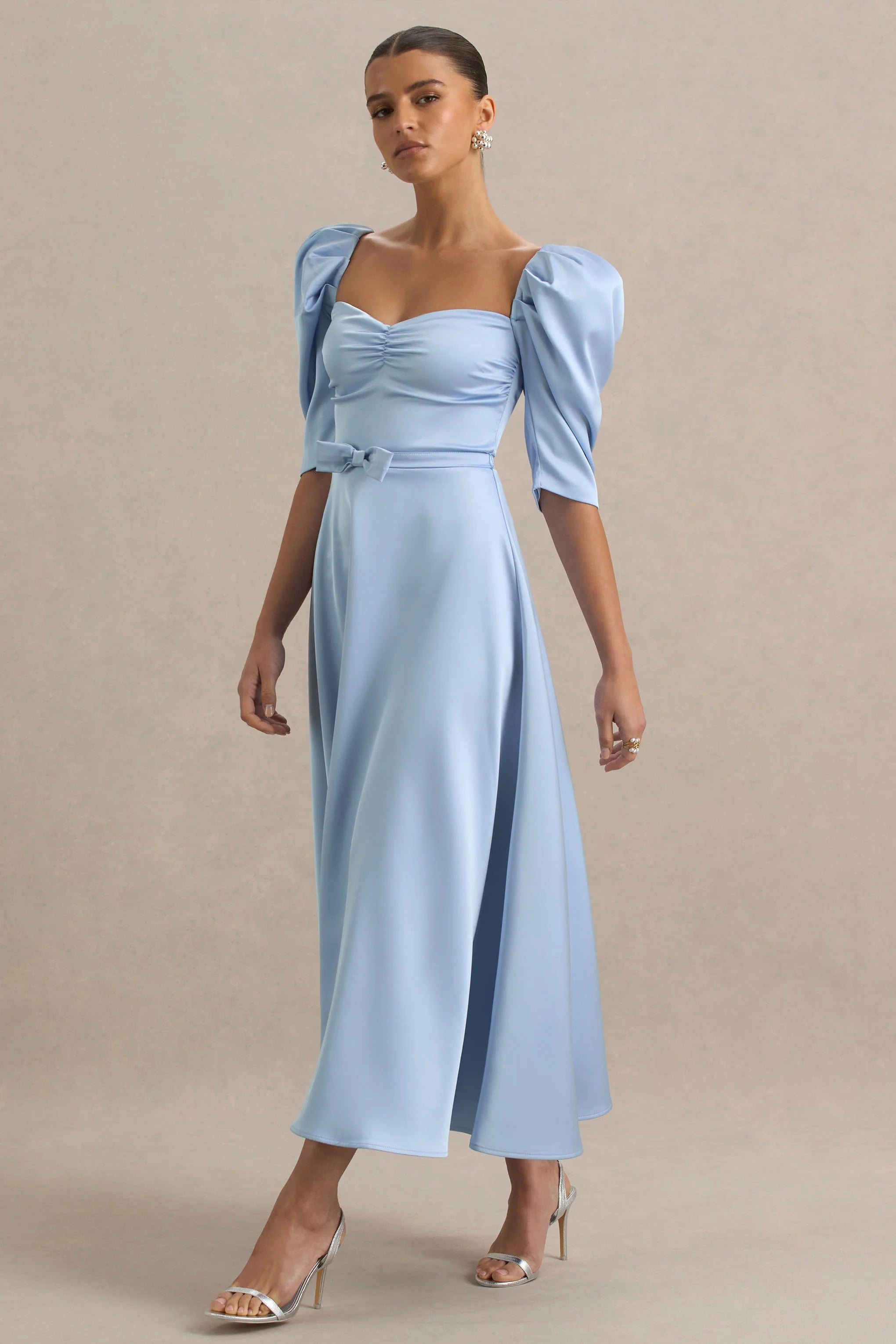 Become a vision of timeless elegance and allure in Rosey. This midi dress is cut from our premium stretch satin, in a stunning powder blue hue, offering a flawless fit for any occasion. The sweetheart neckline adds a touch of soft femininity, while the structured sleeves provide drama and sophistication. Cinching the waist with a delicate bow detail, Rosey creates a sculpted silhouette that's effortlessly chic. Whether you're attending a wedding or a glamourous dinner, this showstopping piece ensures you make an unforgettable entrance.