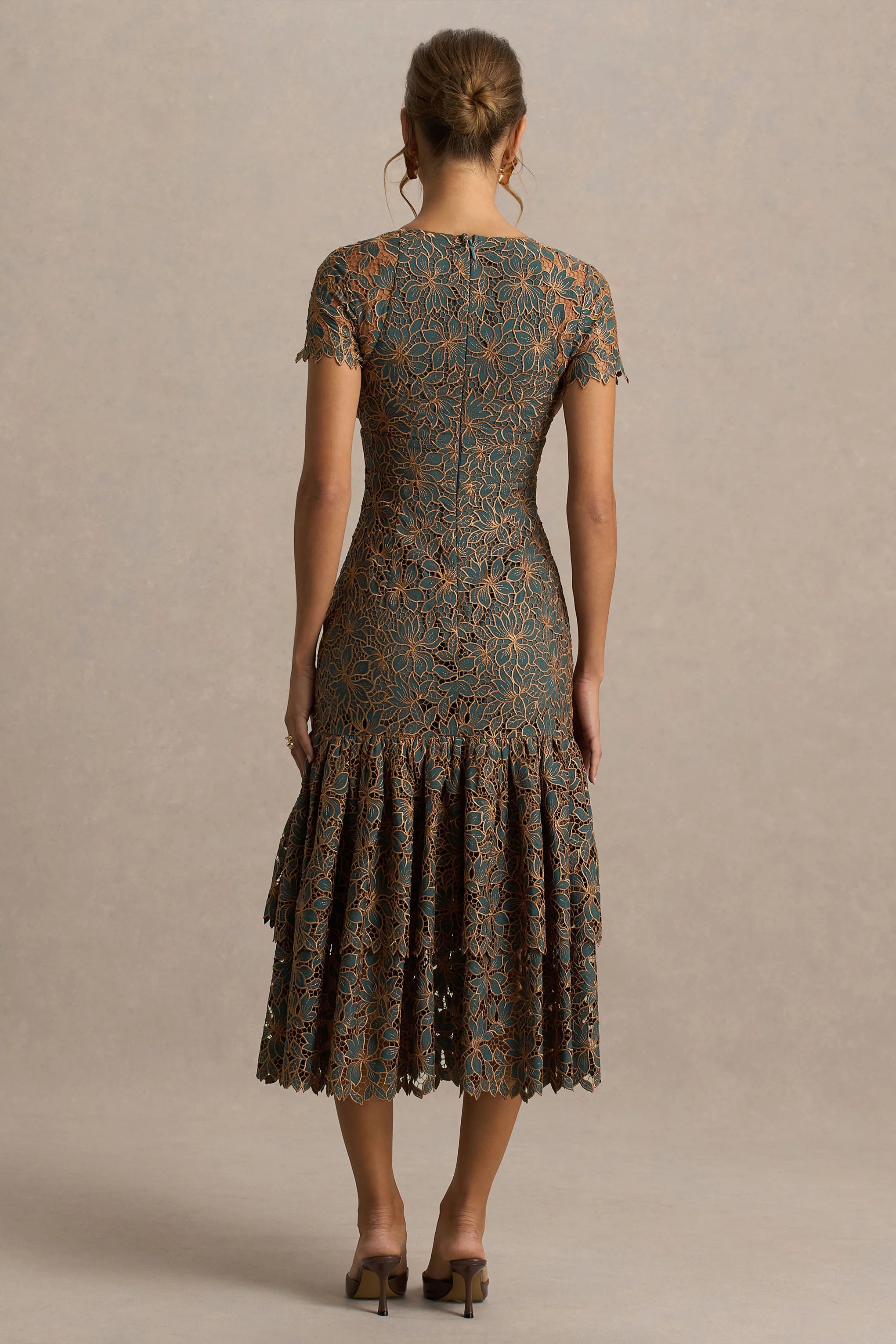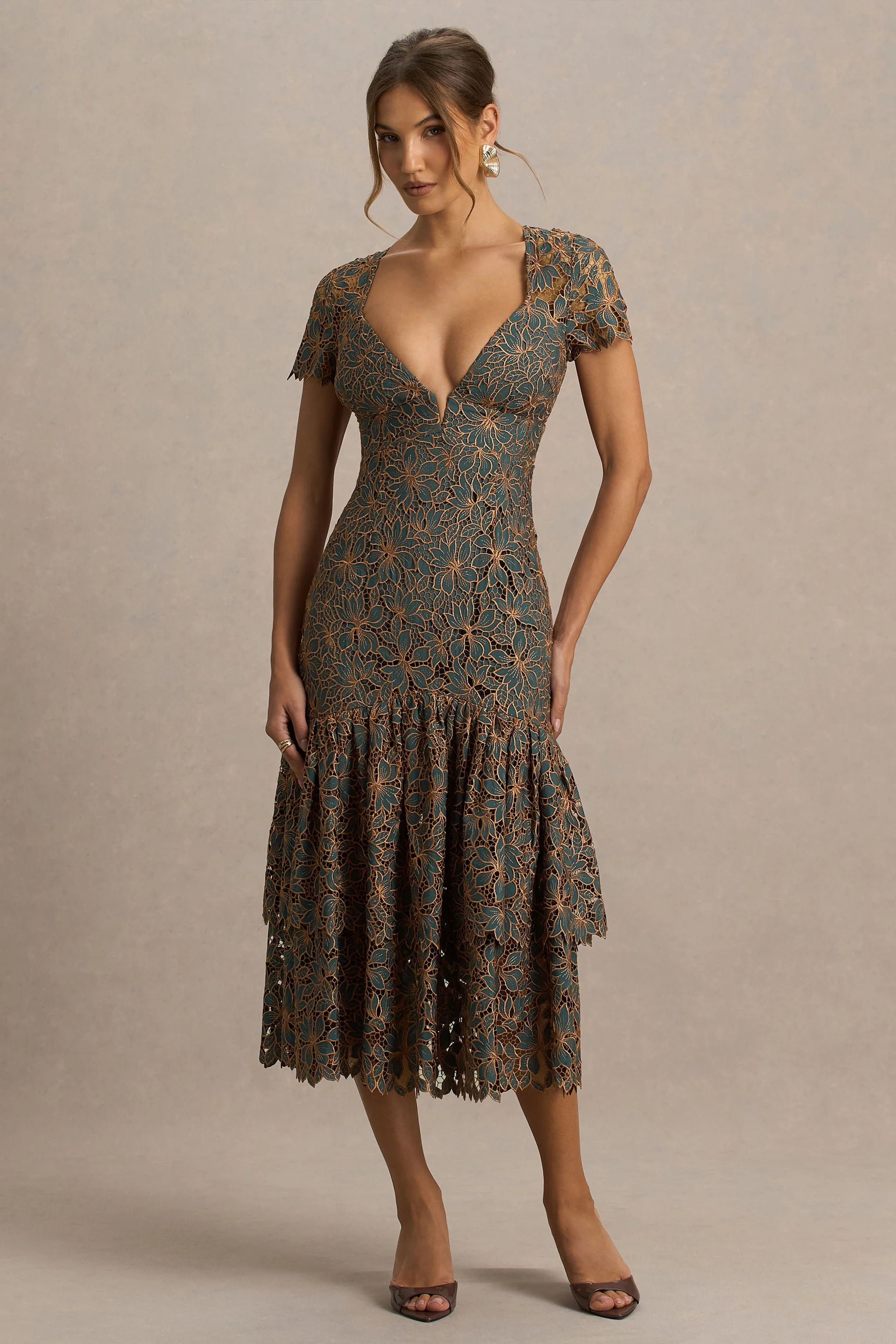 Step into effortless elegance with Sabrina. Crafted from our premium dark green and rust embroidered woven fabric, this midi dress exudes sophistication with every movement. The daring plunge neckline meets a tiered, ruffled skirt, creating a balance of sultry and feminine flair, Sabrina is made for moments that demand attention - romantic dinners, evening soirees, or any occasion where style takes centre stage.