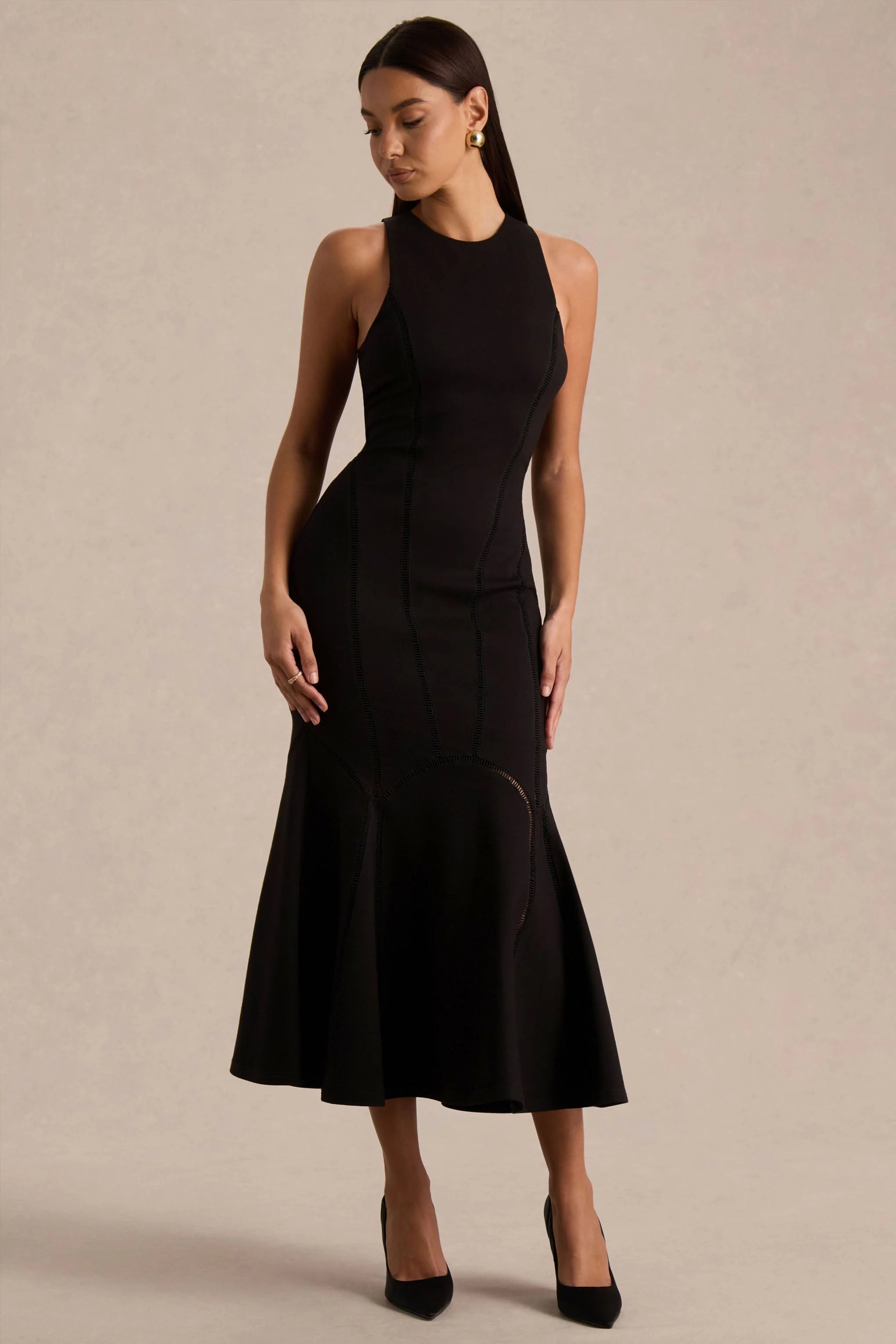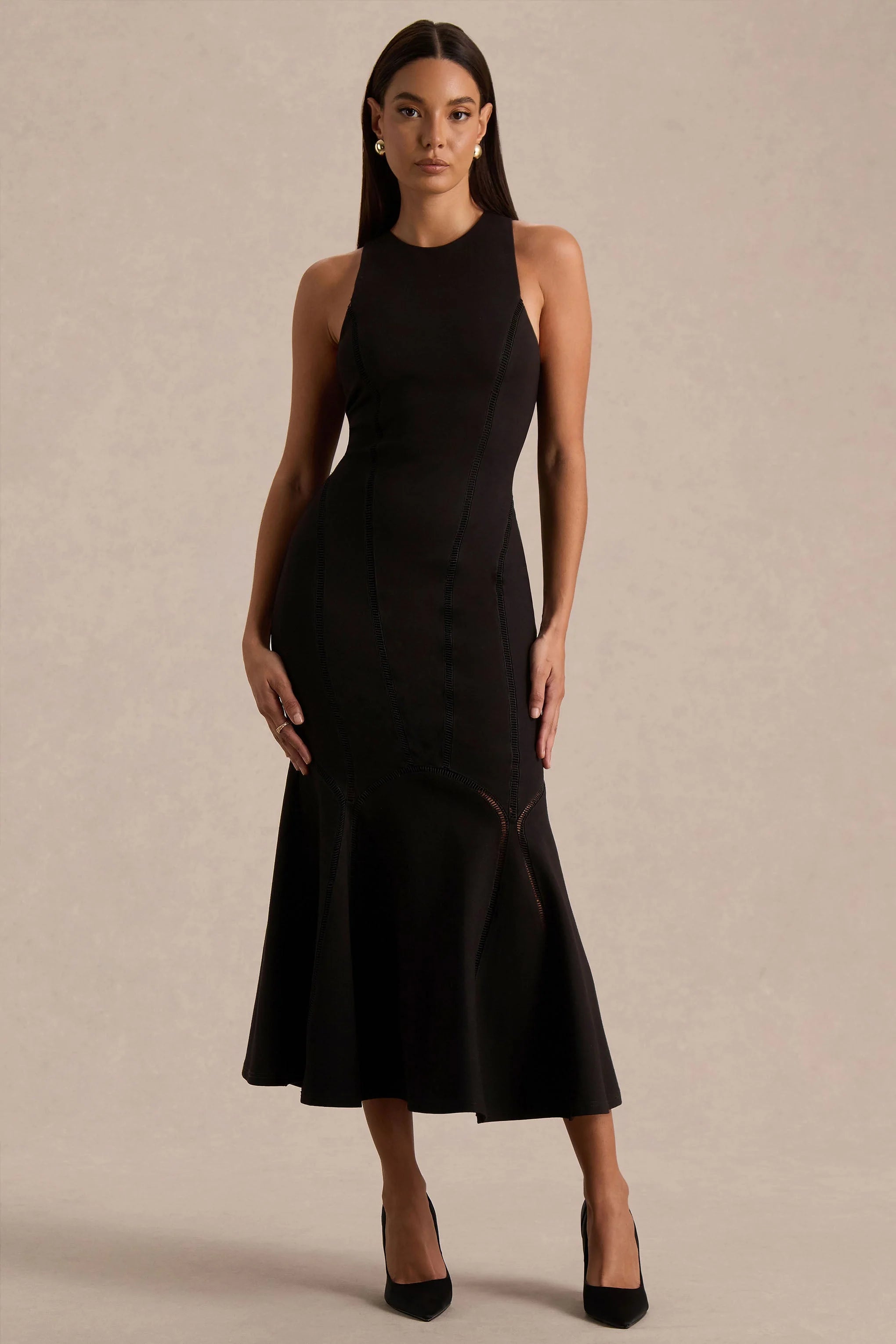Chic and refined with a contemporary twist, Sally is the definition of modern elegance. Crafted from our premium black ponte, this midi dress skims the silhouette before falling into a pleated skirt for beautiful movement. A sleek crew neckline and drop-waist create a feminine, elongated silhouette, while the ladder trim detailing adds a subtle touch of modern edge. Perfect for occasions that call for understated sophistication with impact.