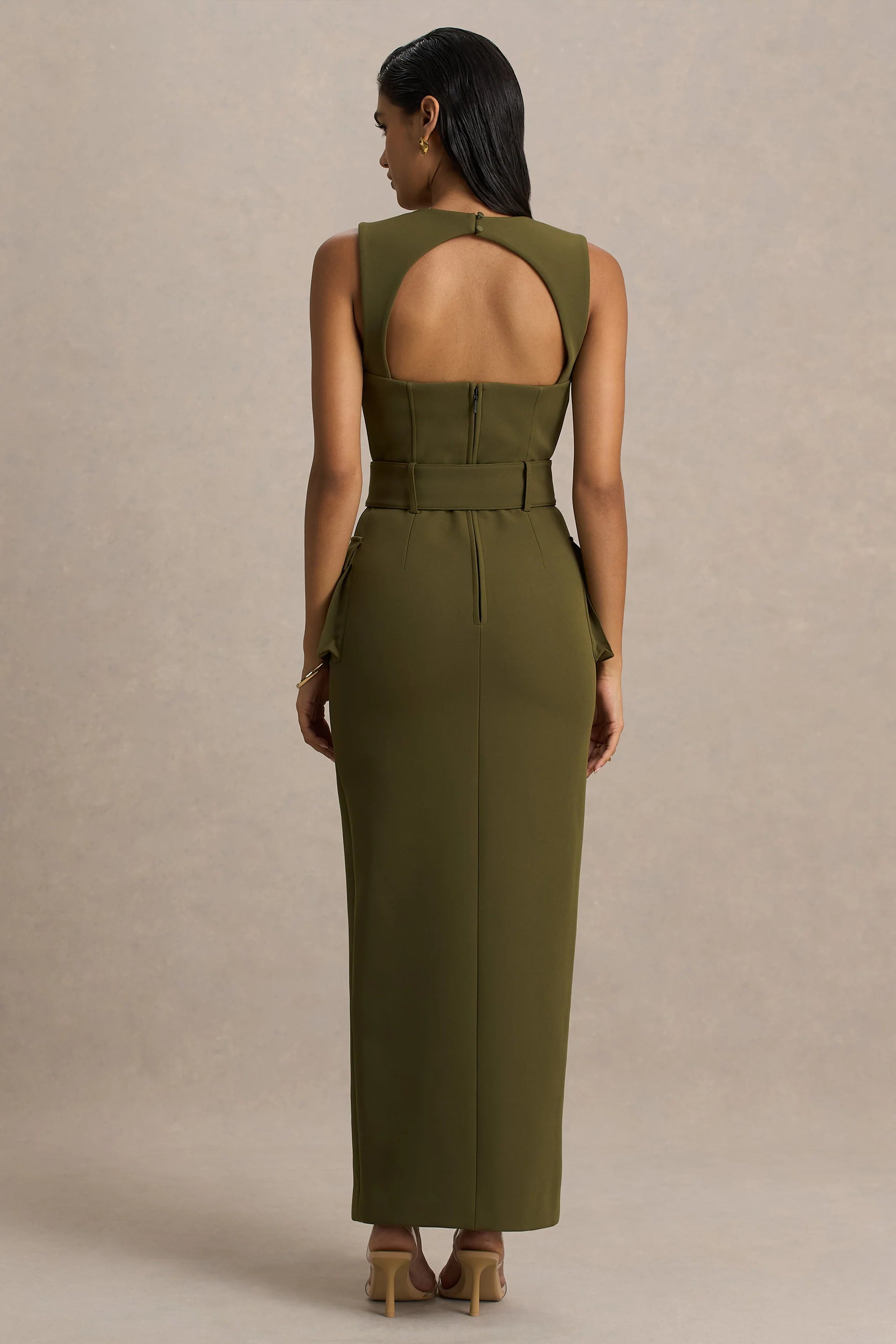 Step into the spotlight with Sandra a dress that exudes effortless elegance with a hint of daring edge. Crafted in our premium olive stretch crepe, it skims the body enhancing ever curve. The square neckline frames the décolletage beautifully, while the gold-detailed belt cinches the waist to create a flattering, feminine silhouette. Front pockets add a modern, functional touch, and the open back introduces a hint of allure. Finished with a front-high split, Sandra is a show-stopping piece made for unforgettable evenings.