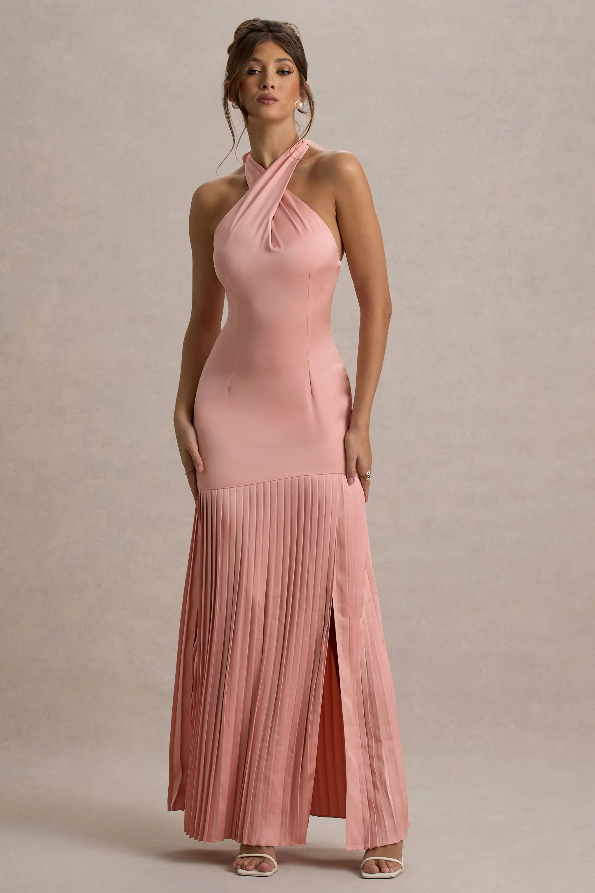 Sculpt your silhouette in our striking maxi, Sansa. Wrapped in a dreamy pink satin, this floor-sweeper commands attention through its crossed halter neckline, plisse detailing and sultry split skirt. For a stunning bridesmaid look, we would style Sansa with some timeless golden earrings like Dreamer.