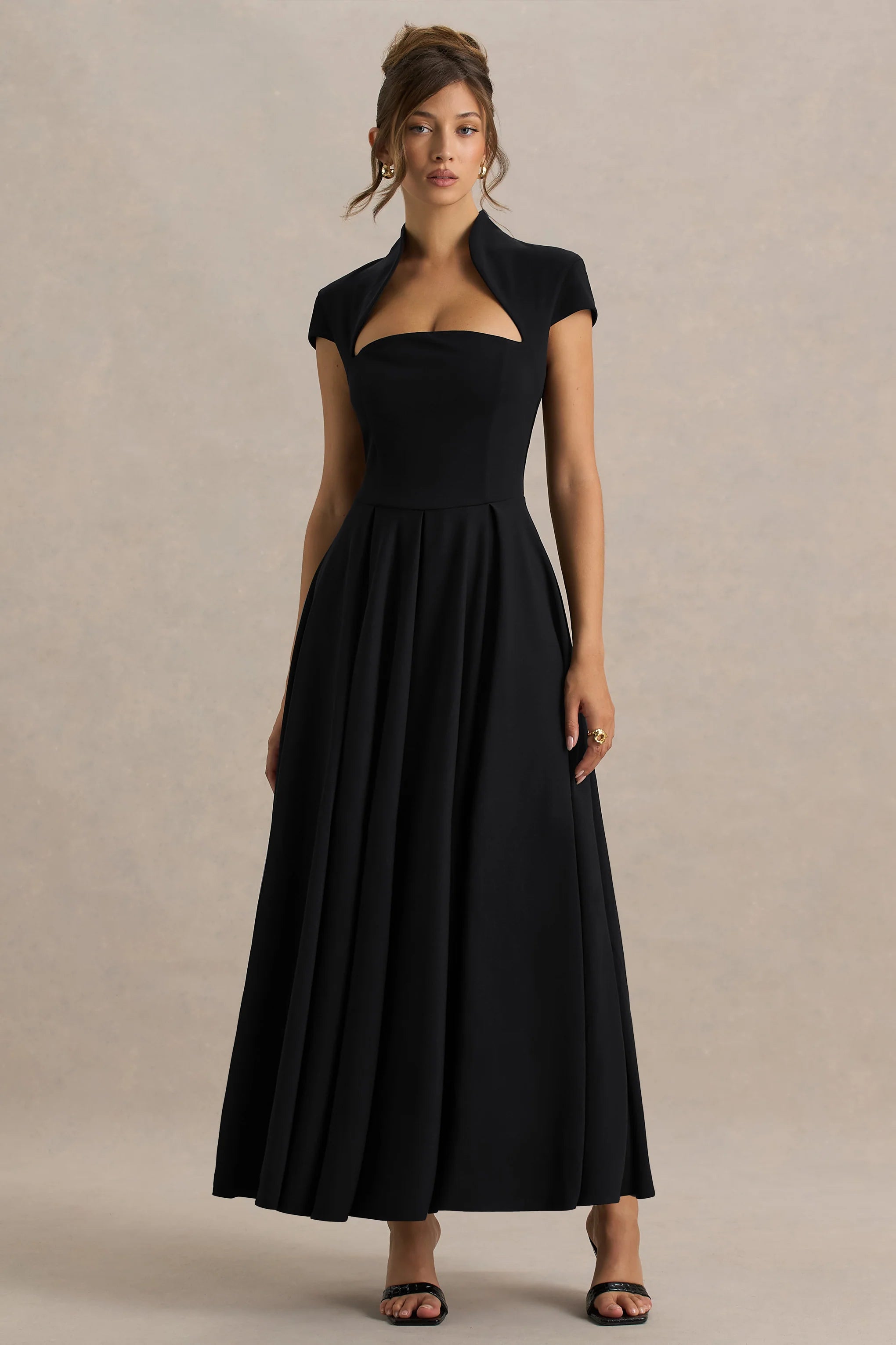 Sculpted sophistication meets refined drama in Scarlett. Cut from our premium scuba crepe in a deep black hue, this maxi dress provides a sleek, structured finish, designed to celebrate your silhouette. The square neckline adds a modern edge, complimented by the timeless cap sleeve, while the tailored seams ensure effortless elegance from every angle. Style Scarlett with gold accessories and a glamorous up-do .