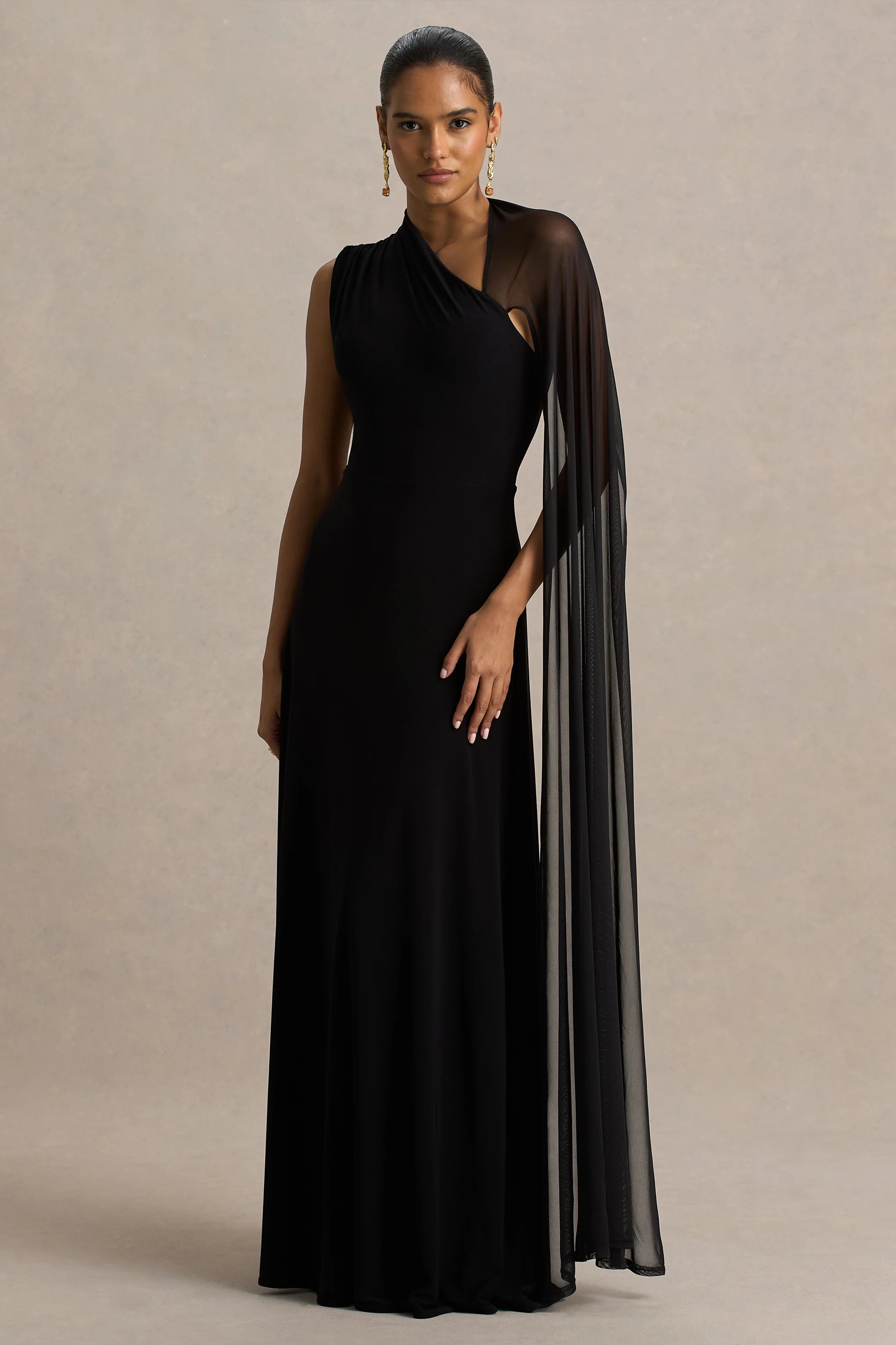 Make an entrance in Selena, the epitome of sleek sophistication with a striking edge. Crafted in a black hue of our premium stretch jersey, for that signature sculpted fit, and a sheer mesh cape sleeve for a touch of drama. This gown features a high neckline balanced by a daring chest cut out detail, the cape sleeve adds movement that exudes elegance with every step. Finished with flattering ruched detailing, in Selena you will feel as good as you look. Style with sleek heels and statement earrings for a captivating look.