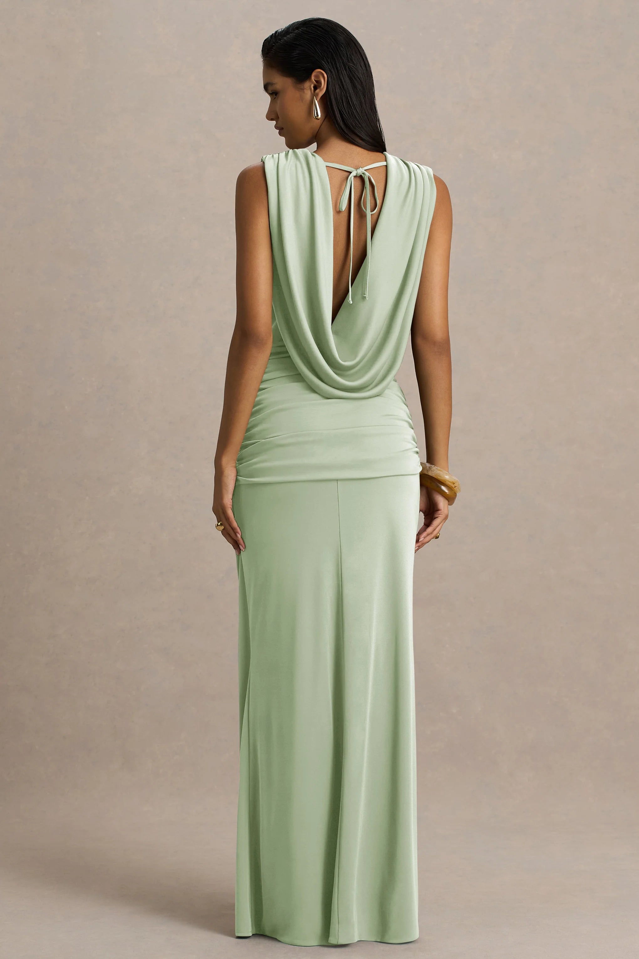 Turn heads in Serafina, a showstopper designed to captivate. Crafted from our premium stretch jersey, in a light green shade, this maxi dress skims and sculpts your figure seamlessly. The extreme plunge neckline brings high-impact drama, perfectly balanced by a wrap front that cinches the waist and enhances your curves. Ruched detailing flatters the form, while the back features a statement cowl drape and adjustable self-tie detail for a custom fit. Serafina is elegance turned all the way up.