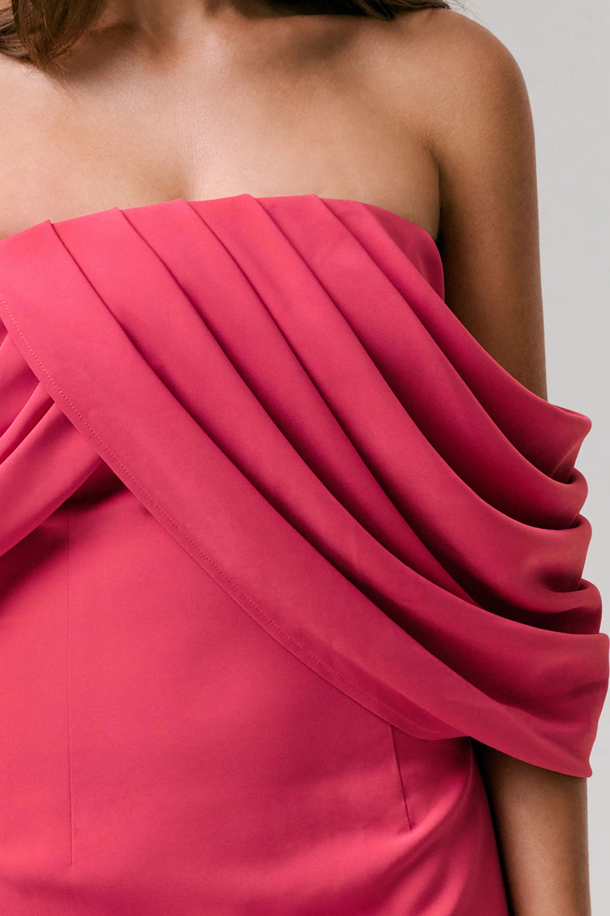 Step into timeless sophistication with Serene, a gown designed to leave a lasting impression. Crafted from a hot pink shade of our premium stretch chiffon and crepe, this maxi is the definition of graceful elegance. Featuring a romantic bardot neckline and draped sleeves, Serene flatters with every movement. The internal corset sculpts your silhouette for a flawless fit, making it the perfect choice for black-tie moments, bridesmaids, or any occasion that calls for timeless glamour.