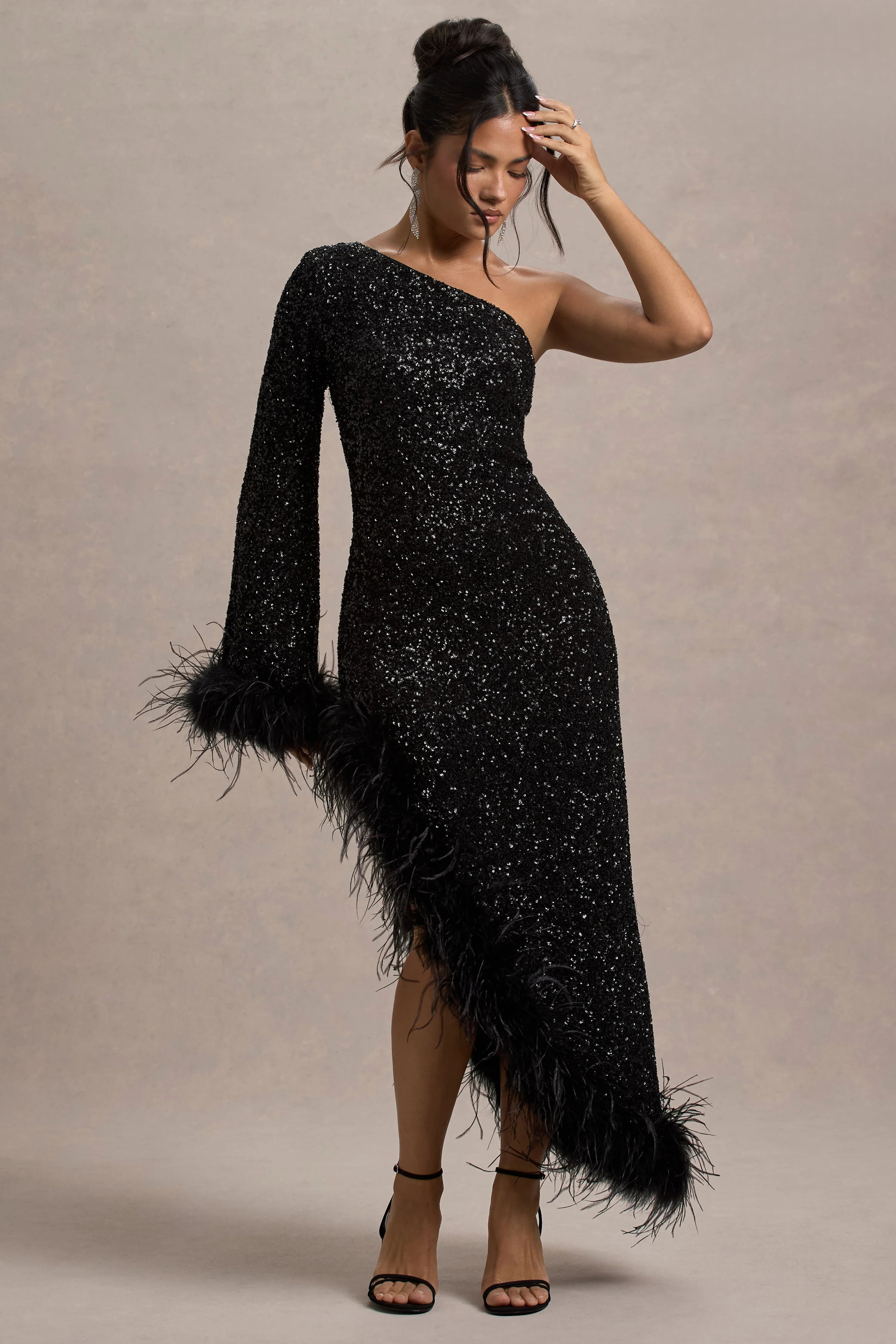 Steal the spotlight this party season with Shadow, our sparkling maxi dress. Effortlessly coated in shimmering black sequins, this asymmetric maxi is defined by it's one-shoulder neckline and lavish feather trims. Let Shadow do the talking at your next gala and team yours with a sleek bun and subtle accessories.