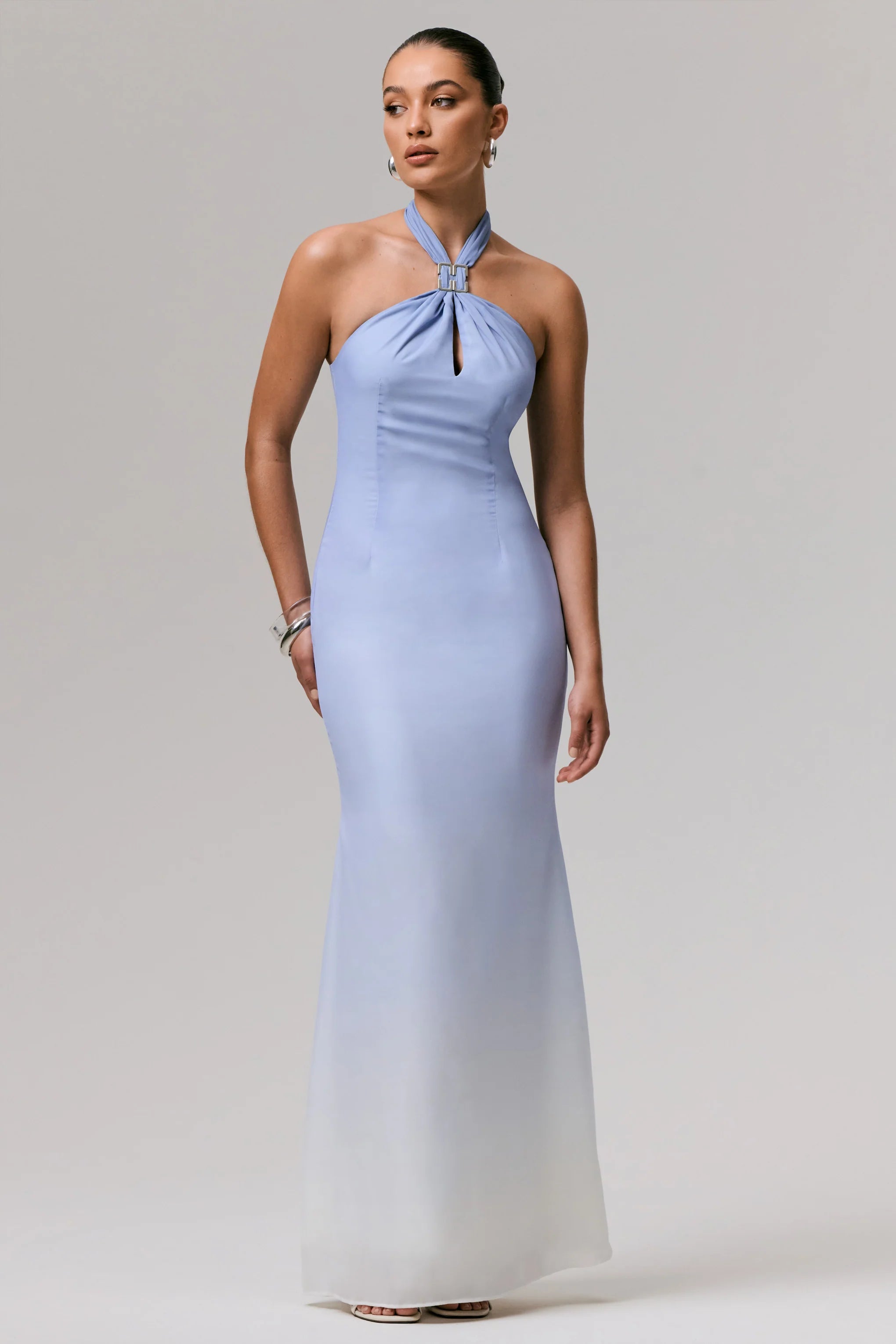 From destination weddings to summer soirees, Sharni will be your go to this season. Curated in our premium chiffon, for an elegant finish, in a soft shade of blue ombre. Featuring a halter neckline, with a striking metal trim and a chest cut-out detail for just the right amount of drama, this piece ensures you won't be forgotten.
