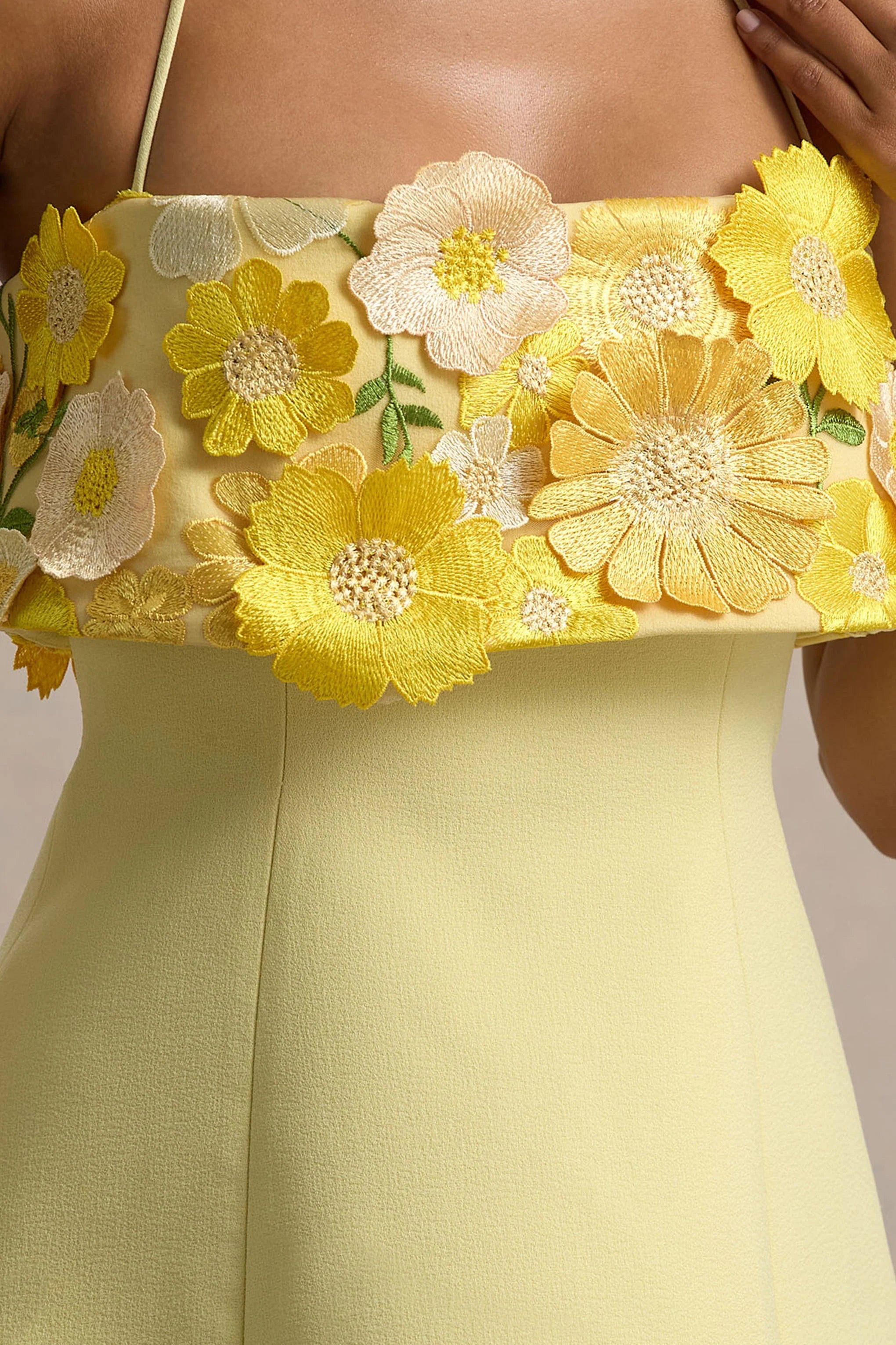 Premium crepe and 3D floral in Lemon (95% Polyester, 5% Elastane)