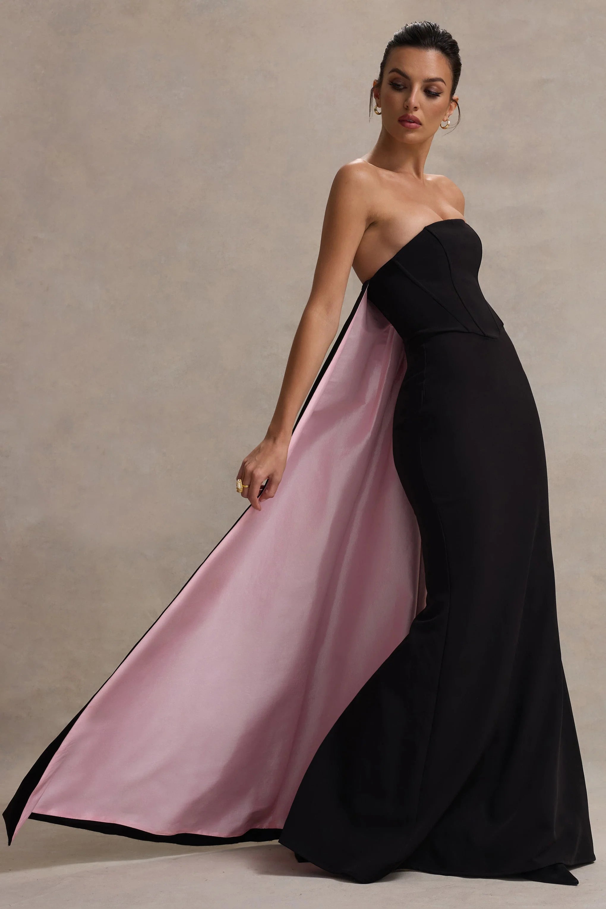 If you're looking for an entrance-making dress, She's Trouble is it. Exuding a dark glamour, this black maxi dress features a classic bandeau neckline and sculpting boned bodice. A key element of this captivating floor-sweeper is its contrasting pink cape that flows freely behind you as you move.