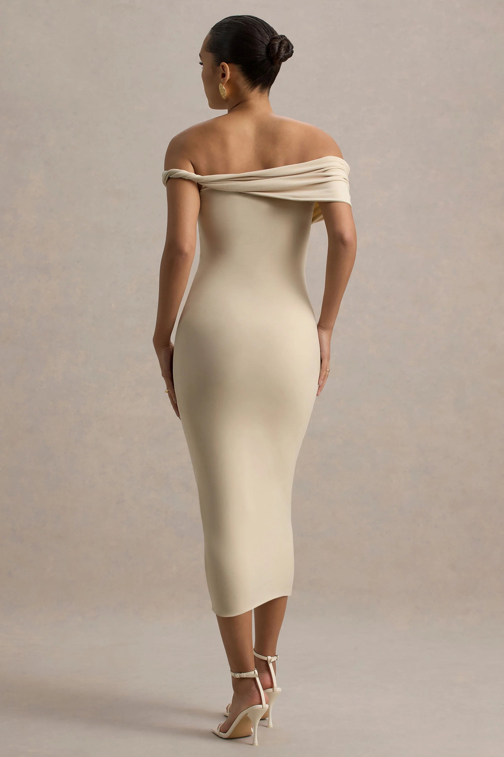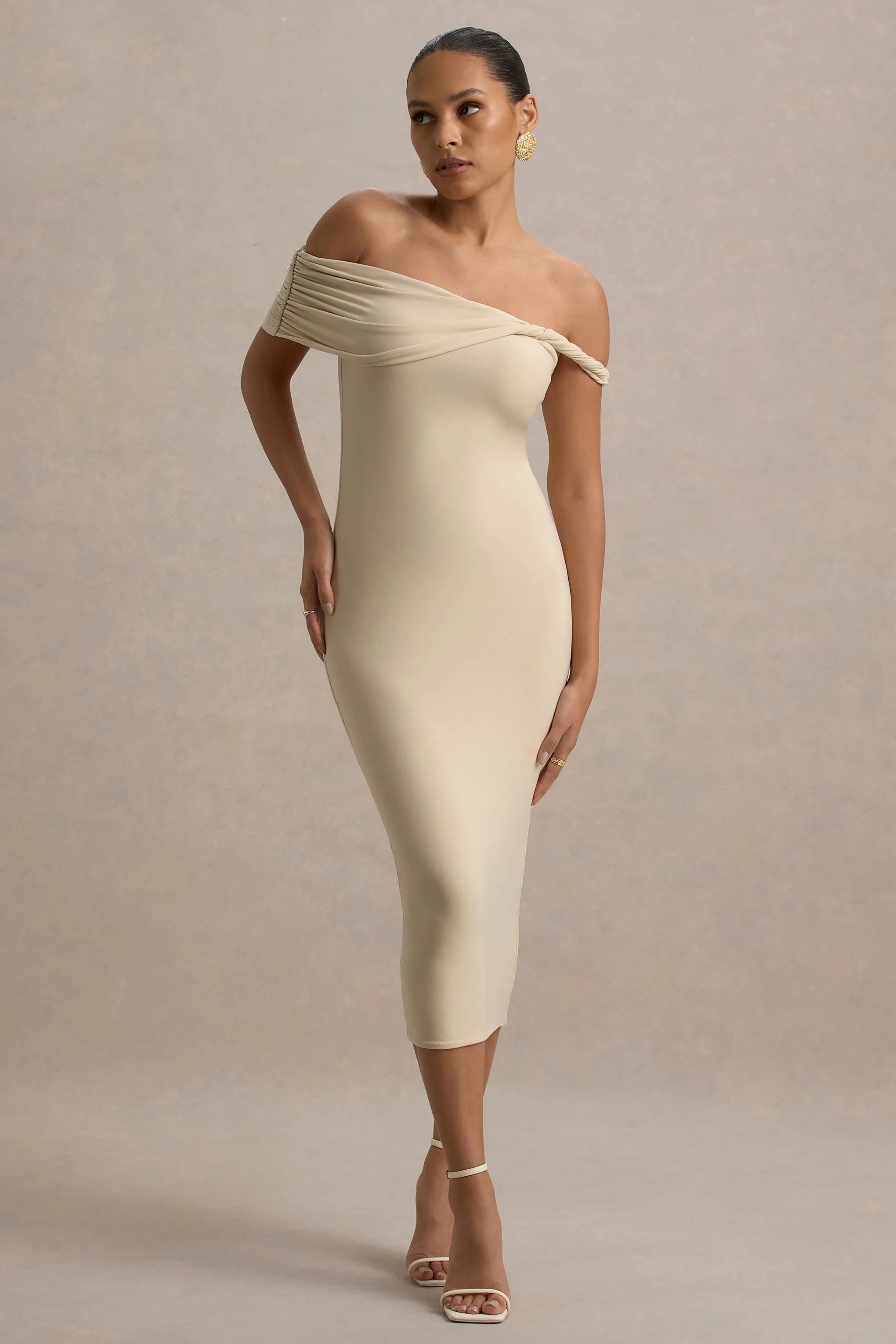 Embrace ultimate femininity in our latest midi Skye. Cut in our premium jersey in a classic sand hue, this dress promises to become a staple in your wardrobe for every occasion with its gorgeous twisted bardot neckline. Pair yours with sleek stilettos for the chicest look in any room.