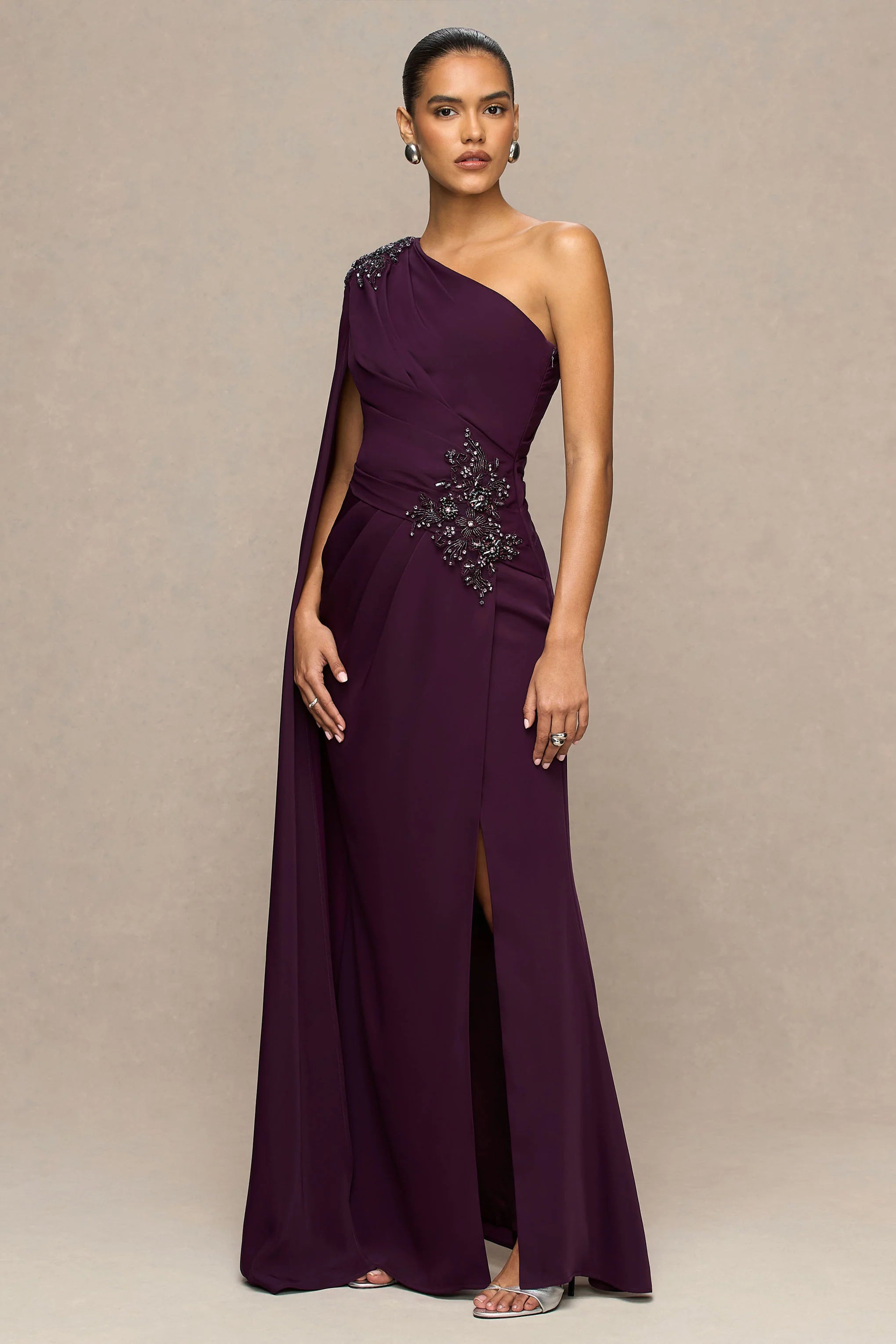 Make an entrance in Solace a statement gown designed for the spotlight. Crafted from pour remium crepe in a rich dark plum hue, it sculpts the body beautifully for a flattering, hourglass fit. The asymmetric neckline brings a modern edge, while the embellished detailing adds a touch of luxe sparkle. Finished with a daring front high split, Solace is the definition of sophisticated allure, perfect for those who love to make an entrance.
