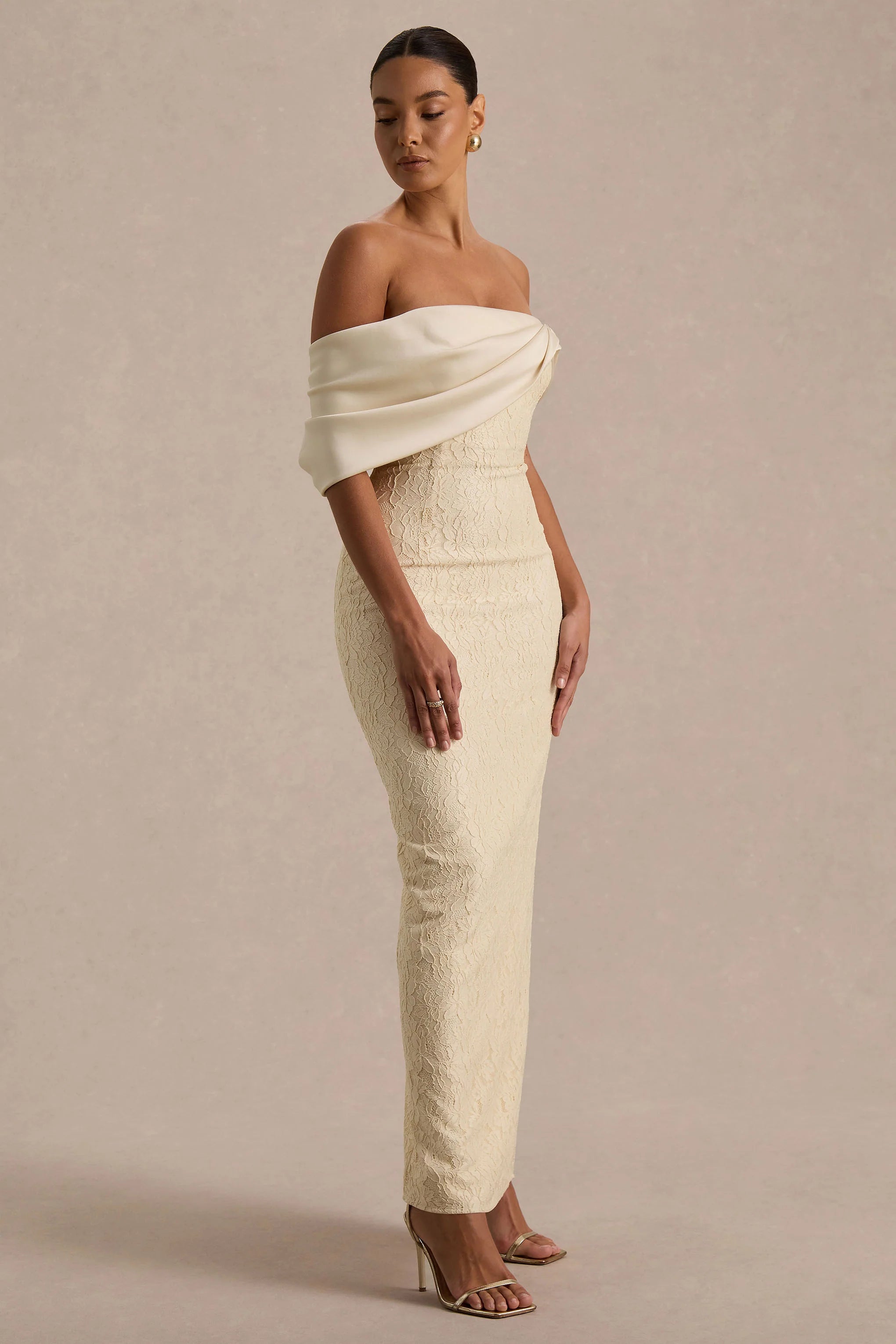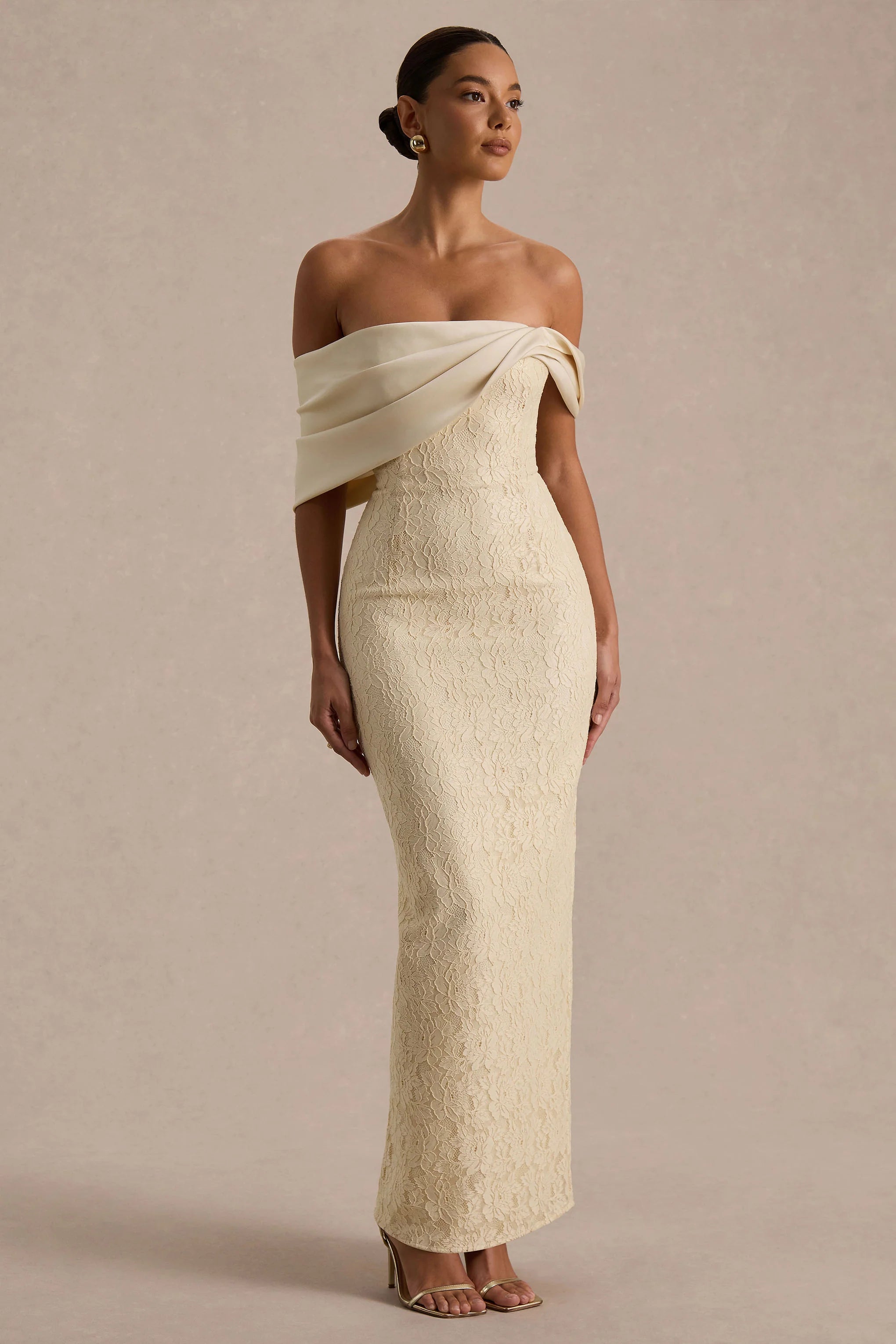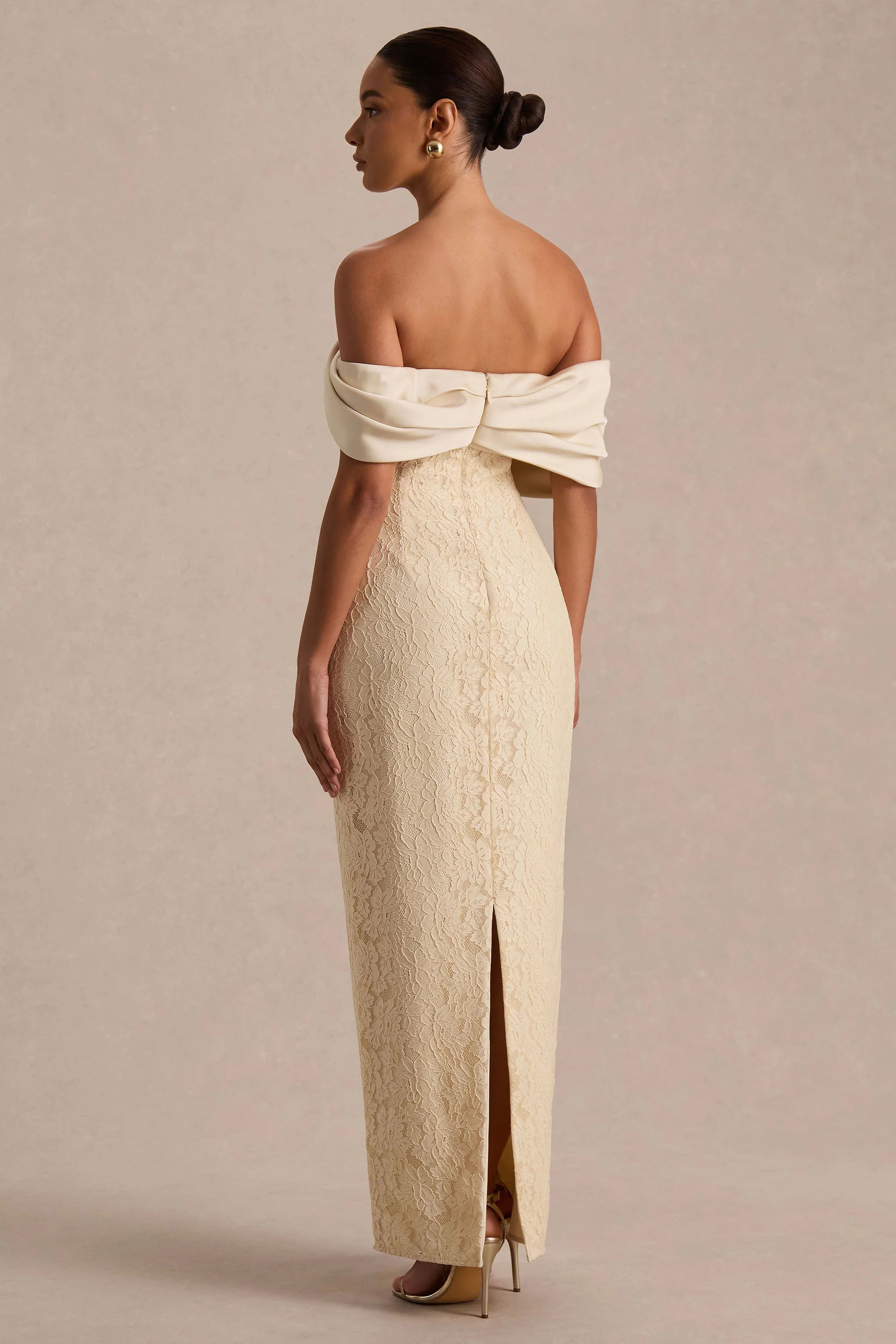 Effortless elegance meets modern romance in Solora. Crafted from our premium cream lace, this maxi dress is all about timeless glamour. Featuring a twisted bardot neckline that frames the shoulders, while the centre-back split adds a subtle touch of drama. Flowing, feminine, and unforgettable, Solora is the ultimate choice for evenings where sophistication and statement style collide.