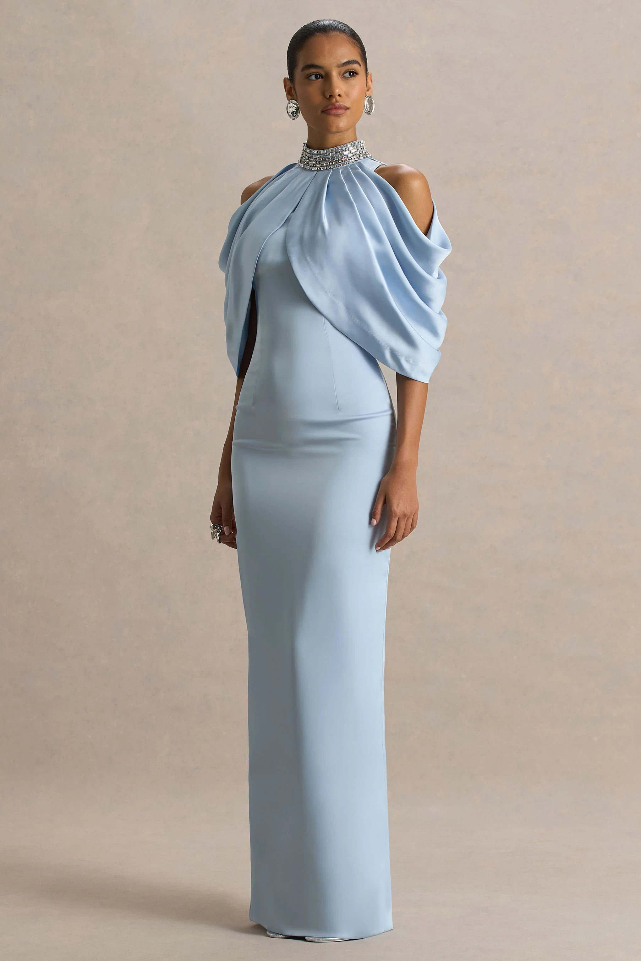 Make a statement in Sulliana, a refined design destined for unforgettable occasions. Crafted from our luxurious powder blue satin, this maxi-length gown drapes beautifully over the body for a sleek, elegant finish. The high embellished neckline adds a touch of opulence, perfectly balanced by soft cape sleeves that move with grace. The centre-back split adds a touch of allure, making this piece the ultimate head-turner. Sulliana is sophistication, elevated.