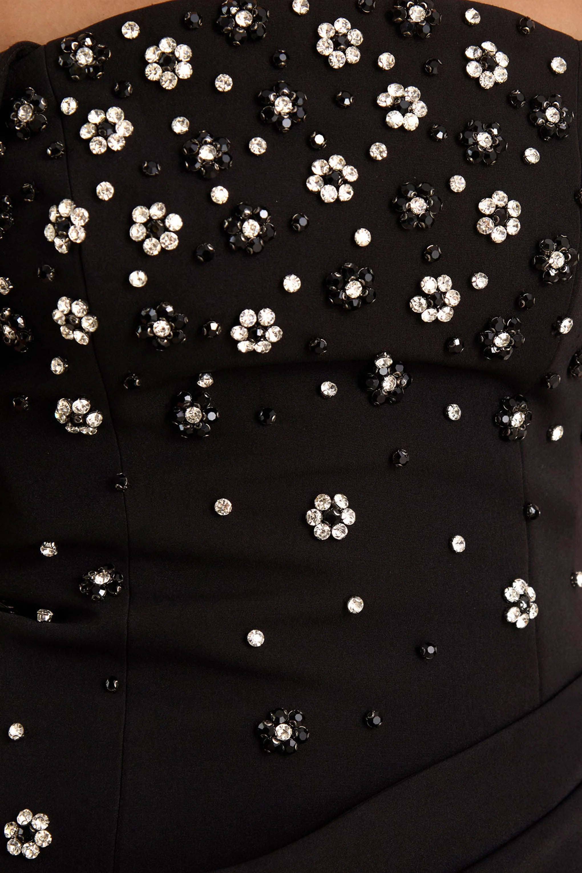Say hello to Sylvia, the midi dress that redefines classic elegance. Crafted from our premium black crepe and satin, its midi length and sculpting silhouette flatter the figure with effortless sophistication. The bardot neckline and hand embellished bodice add a touch of glamour, while the satin draped wrap skirt brings soft movement and polish. Sylvia is your go-to for elevated evenings and refined occasions.