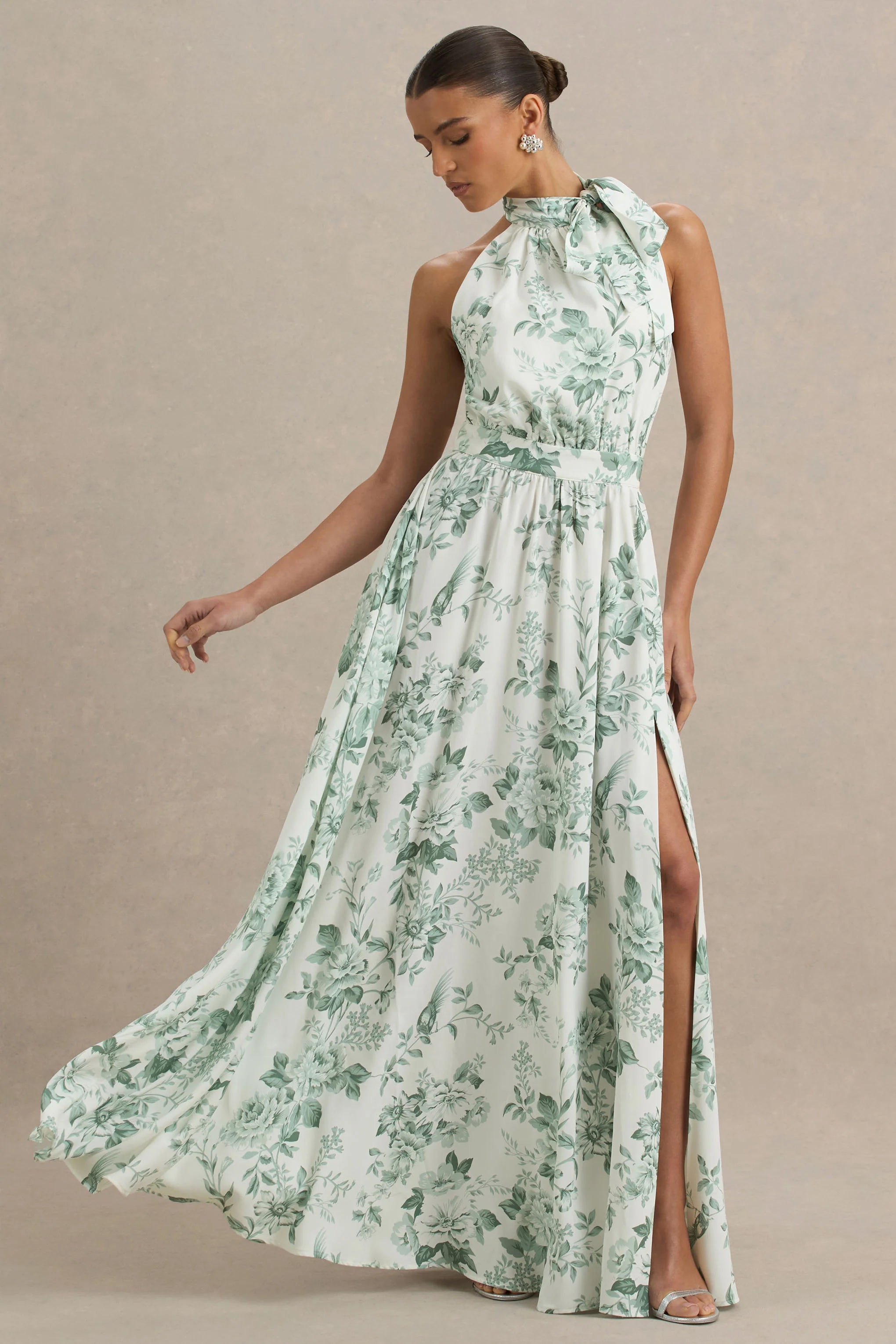 Step into summer looking elegant in our latest maxi, Talia. Cut in a detailed green floral print in our woven fabric, ensuring a breathable and stylish finish. This maxi features a high neckline with a functional tie detail, a chic touch, as well as a high front leg split for a flirty flare. Perfect for all upscale occasions this season paired with a strappy heel.