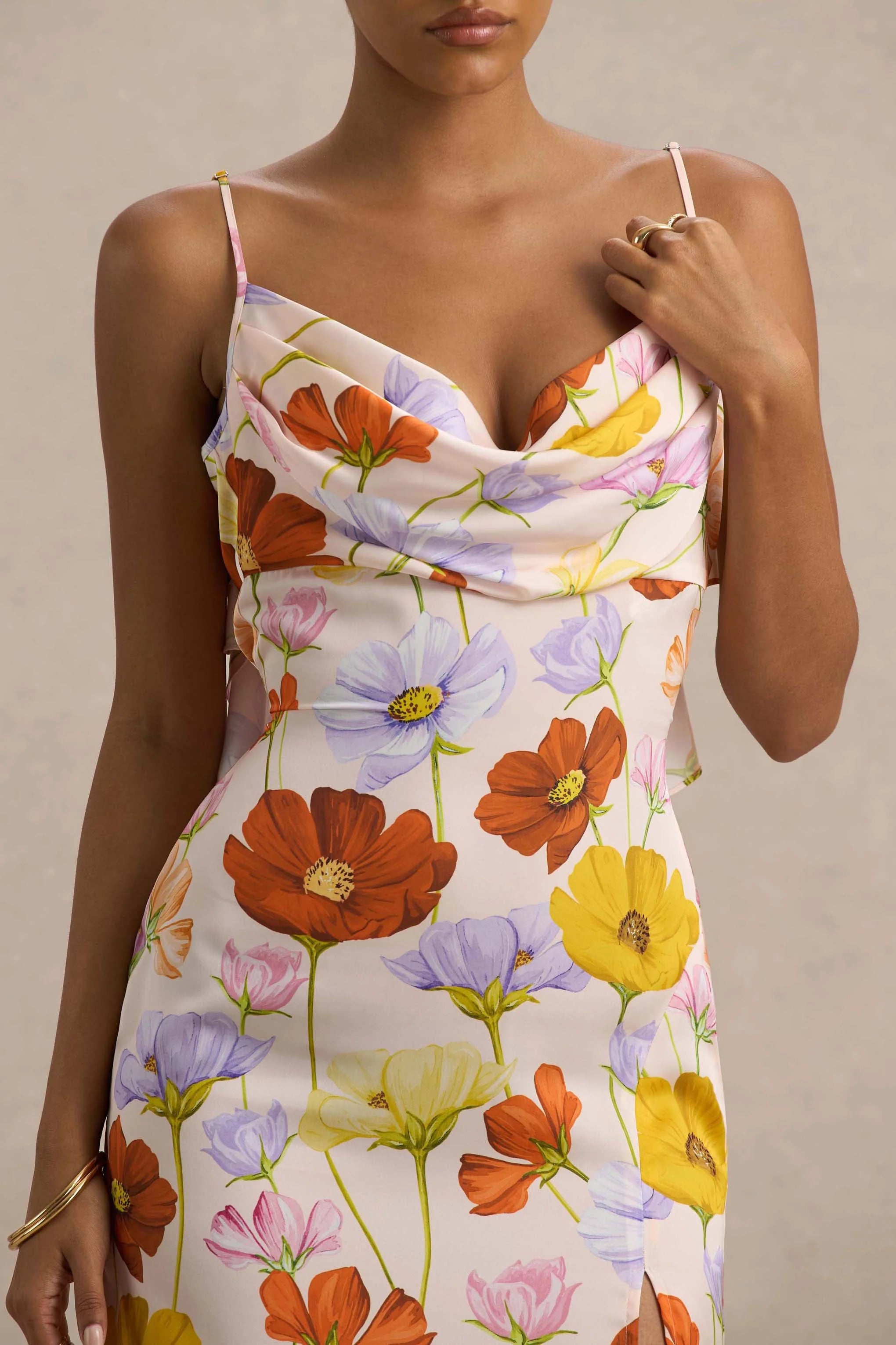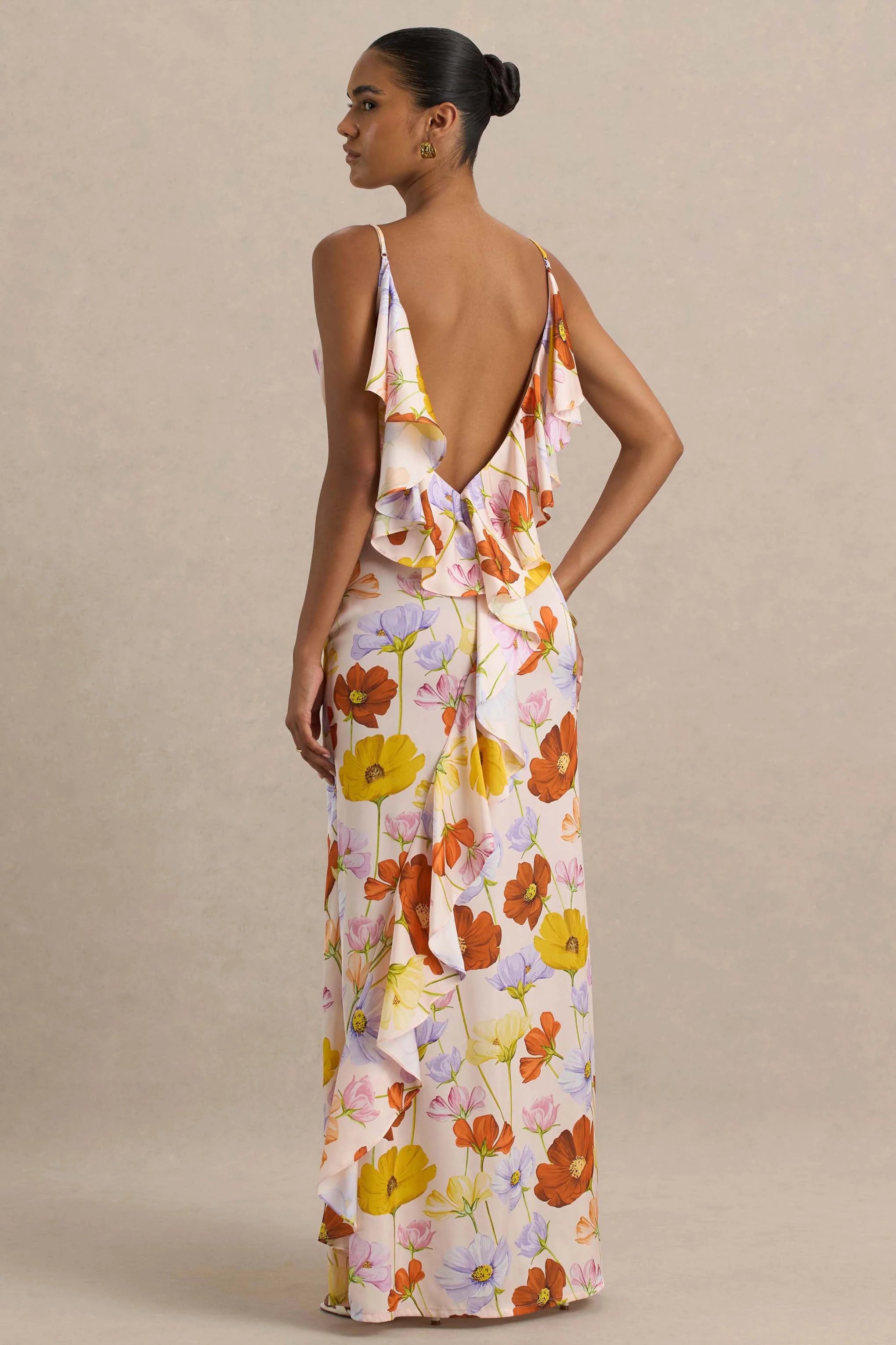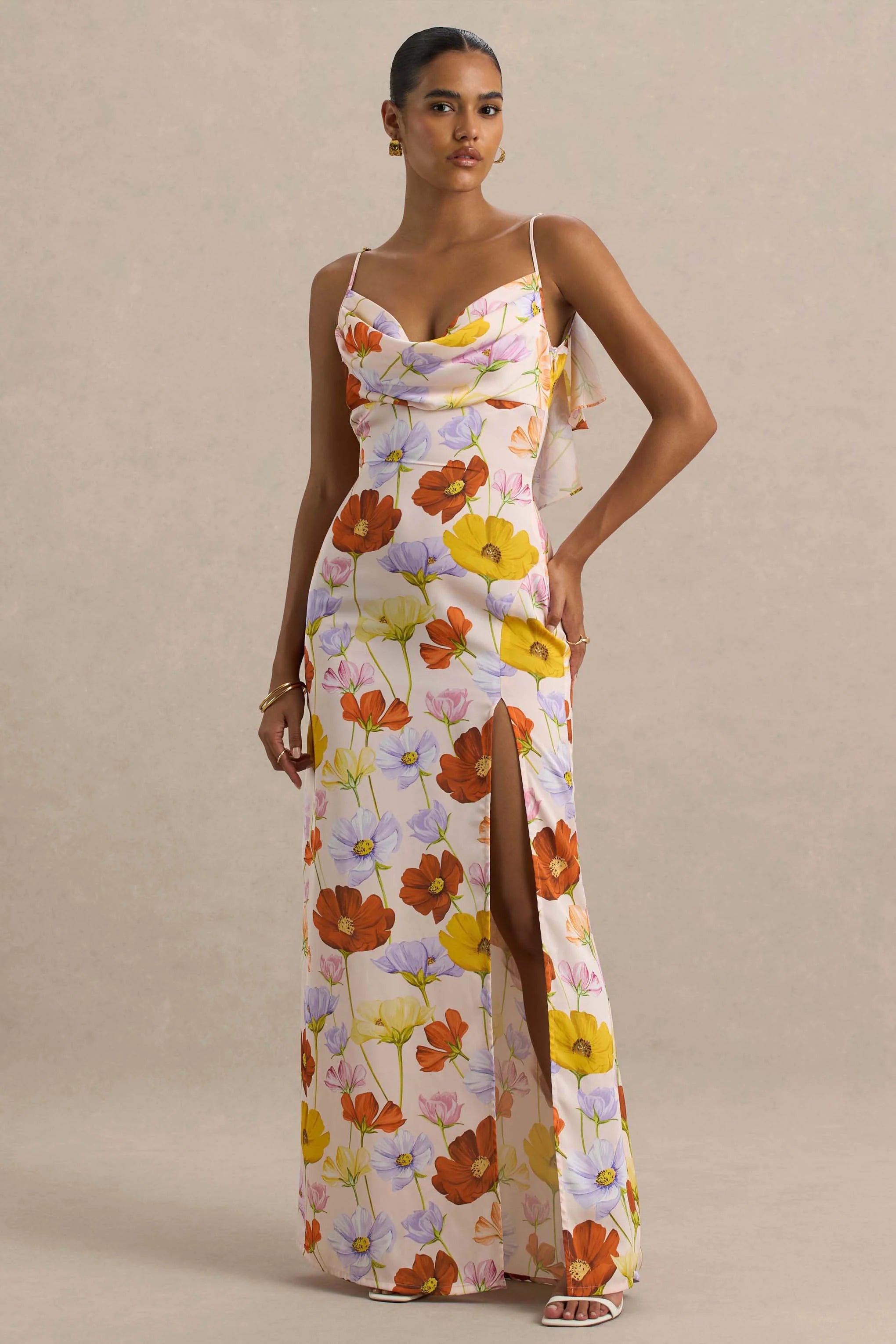 Enchant the room at your next special occasion in Thames. This bold maxi dress is curated in a bright floral print of our premium satin that graciously skims over your curves, effortlessly enhancing your figure. Boasting a chic cowl neckline, that elegantly frames your decolletage, while the v-cut open back elegantly displays your back adding a touch of allure. Finished with delicate ruffled detailing that adds a romantic feel and a front high split for a sultry edge. From garden parties to black-tie weddings, Thames is the perfect piece to impress in.