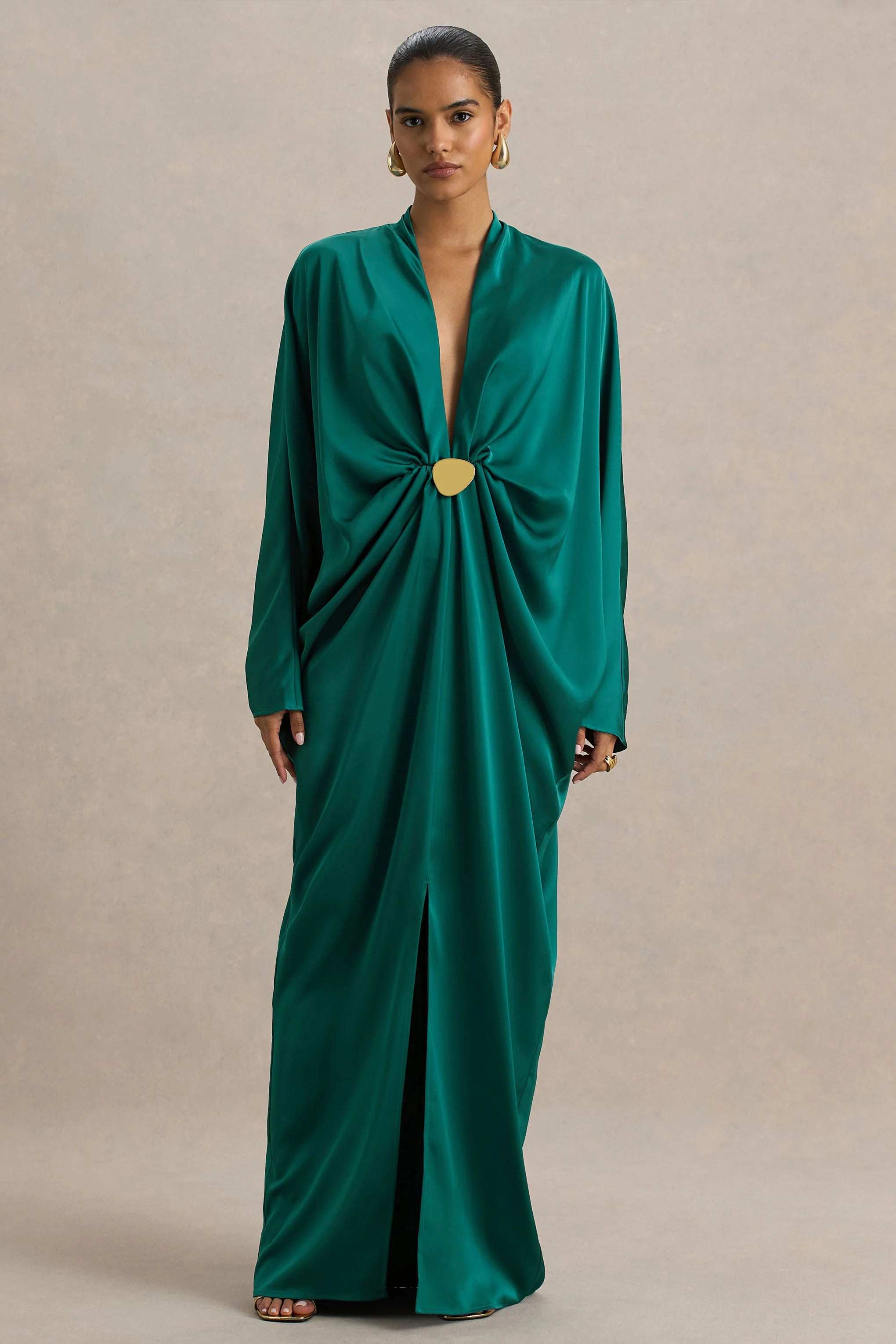 Charm the room with your refined elegance in Tina. Crafted in a bold dark green hue of our premium satin, this gown is timeless and utterly chic. Featuring an extreme plunge neckline that adds a daring yet feminine edge, as well as a sleek gold detail for a luxe touch. The long batwing sleeves are contrasted with a striking front high split, perfectly blending elegance and allure. Style Tina with sleek heels and gold accessories for a look that'll turn heads.