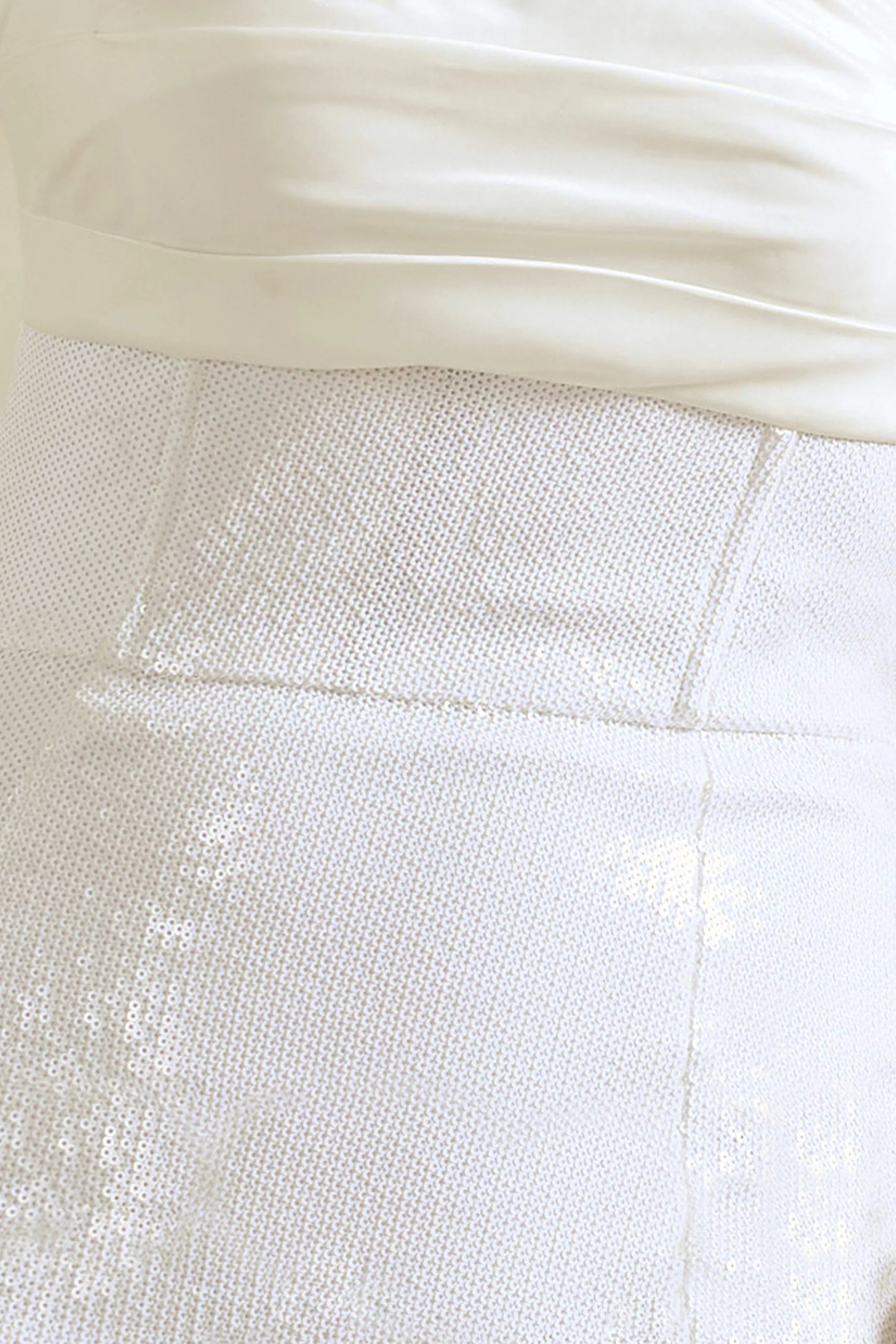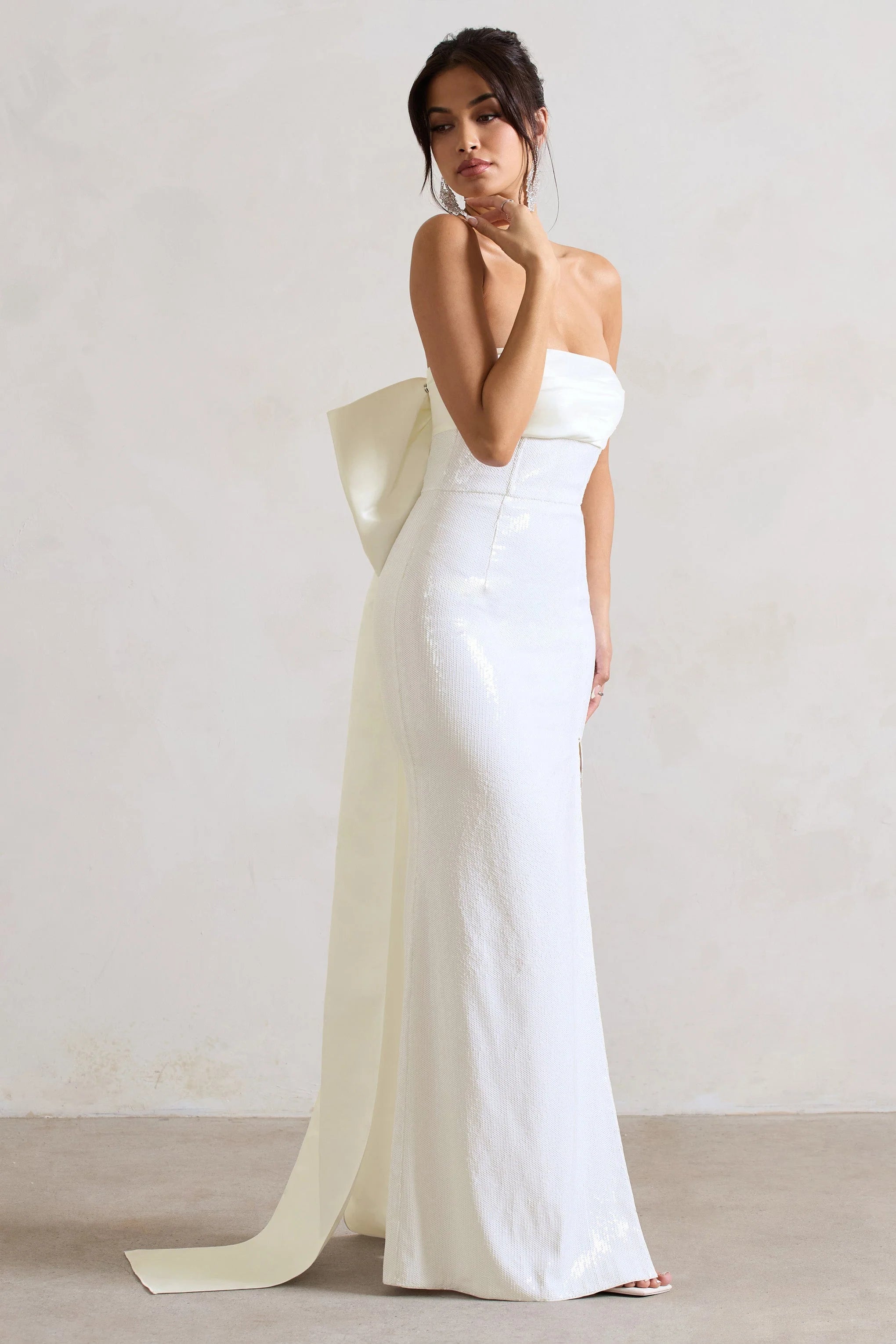Exude effortless elegance in To You, our statement maxi dress. Saturated in shimmering sequins in a white hue, this enchanting piece features a satin panelled bandeau neckline and boned bodice for extra support. An oversized bow transcends To You, sitting delicately across your back and flowing into captivating elongated train. Perfect for black tie events, try pairing yours with some strappy stilettos and sparkling accents.