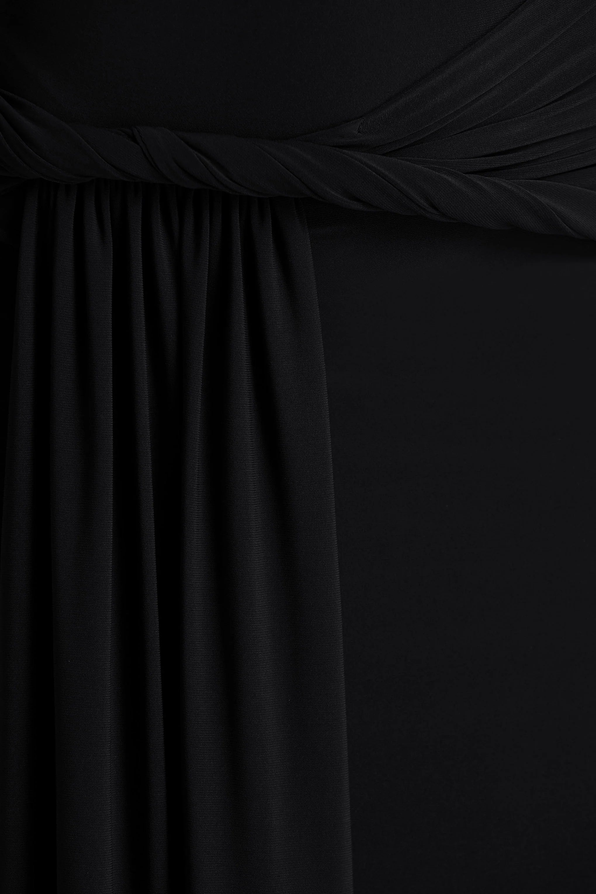 A dress that speaks volumes without saying a word, Tulisa is your invitation to make an unforgettable entrance. Cut in a rich black hue of our premium stretch jersey and cut to a sweeping maxi length, this gown is designed to captivate. The asymmetric neckline and twisted sleeve detail add a modern edge, while ruched accents and a wrap-effect skirt sculpt and flatter the figure. A sash cascades from the waist to hem, bringing movement and fluidity to every step. Chic, confident, and unapologetically bold.