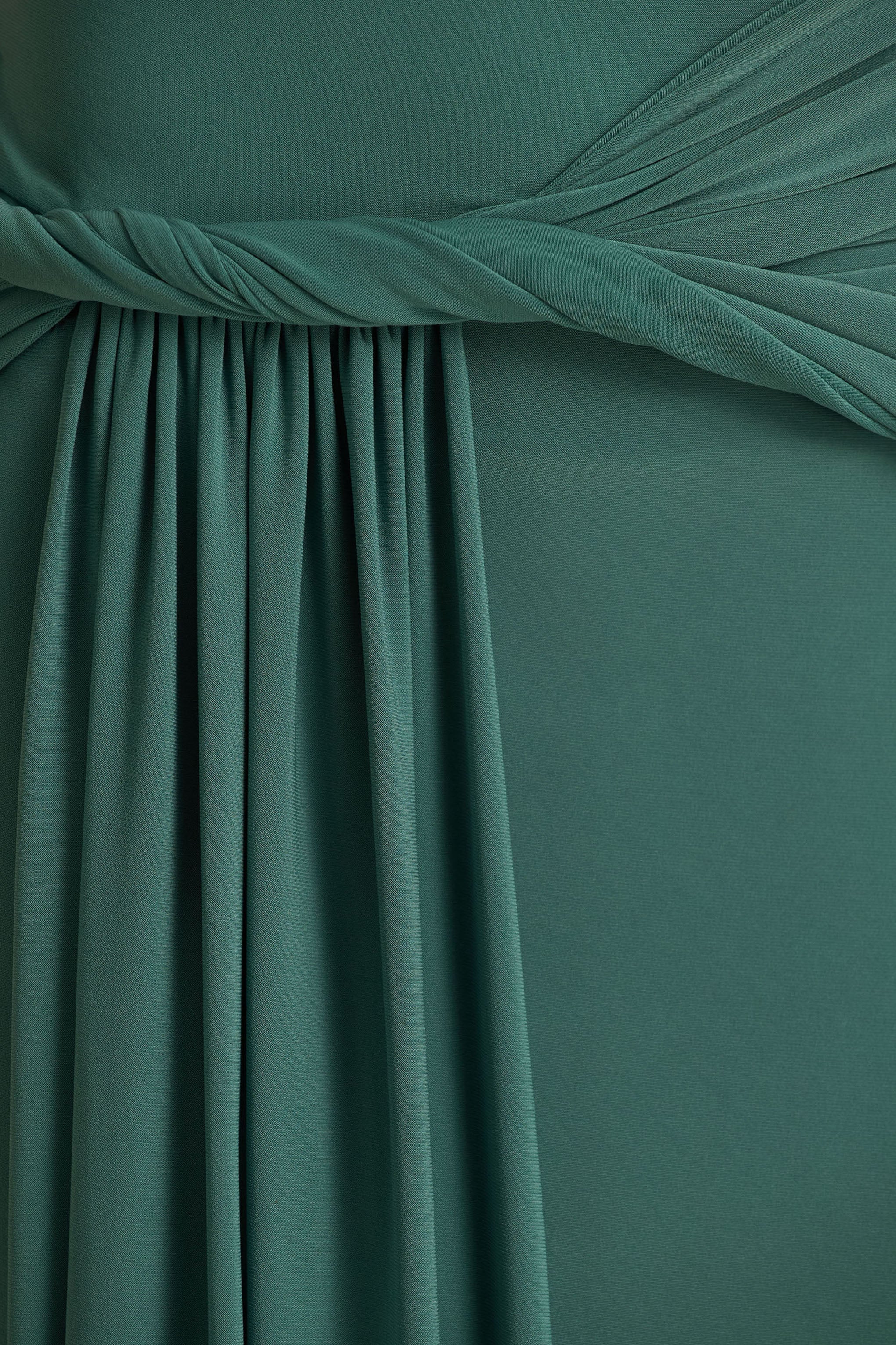A dress that speaks volumes without saying a word, Tulisa is your invitation to make an unforgettable entrance. Cut in a rich green hue of our premium stretch jersey and cut to a sweeping maxi length, this gown is designed to captivate. The asymmetric neckline and twisted sleeve detail add a modern edge, while ruched accents and a wrap-effect skirt sculpt and flatter the figure. A sash cascades from the waist to hem, bringing movement and fluidity to every step. Chic, confident, and unapologetically bold.