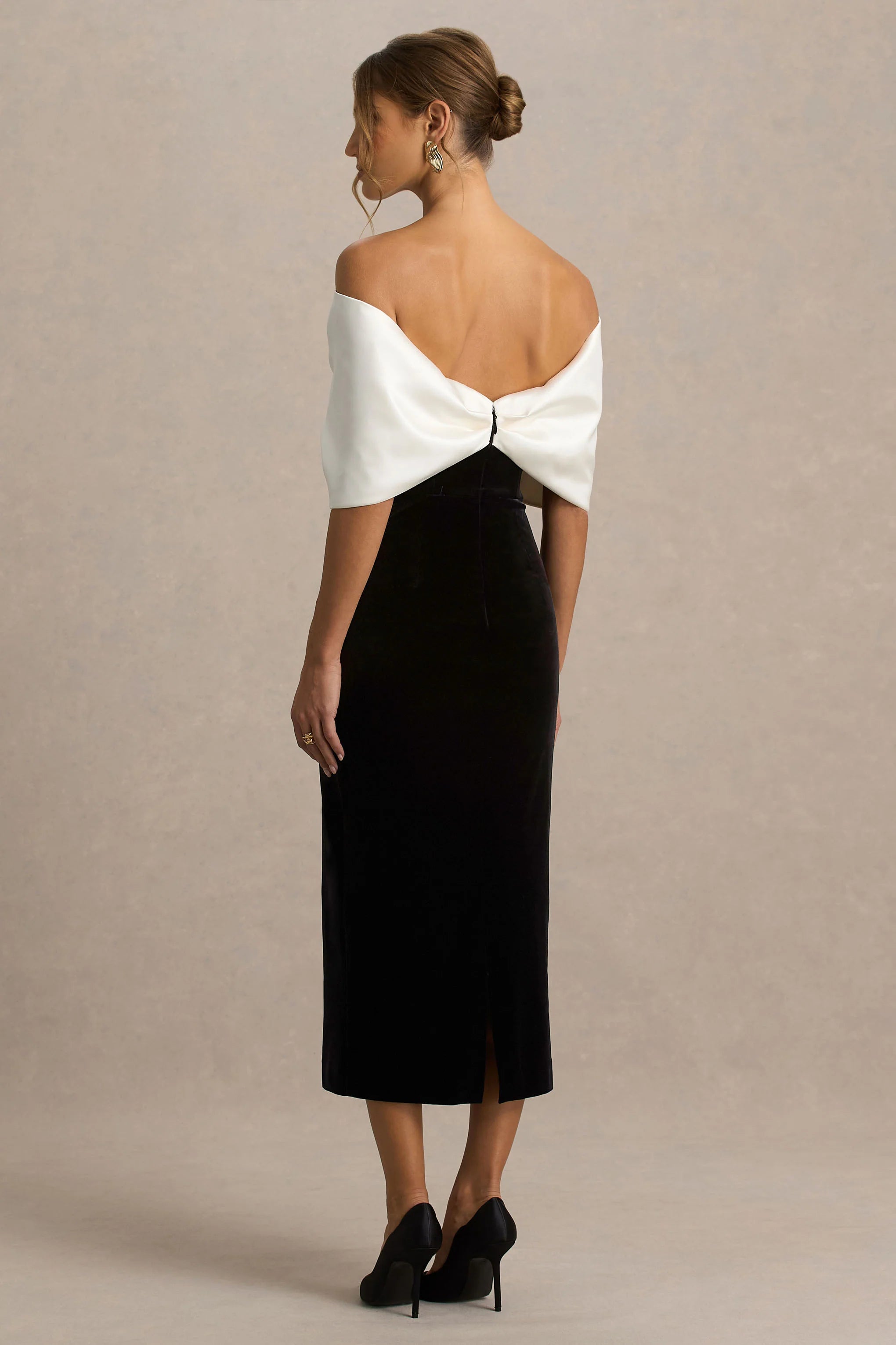 Say hello to Twilight, a monochrome masterpiece made for after-dark elegance. Crafted from our premium black velvet, this midi dress is defined by its statement bardot neckline, adorned with an oversized white bow for maximum impact. A centre-back split adds subtle allure to this sleek silhouette, making Twilight the perfect blend of timeless glamour and modern drama.