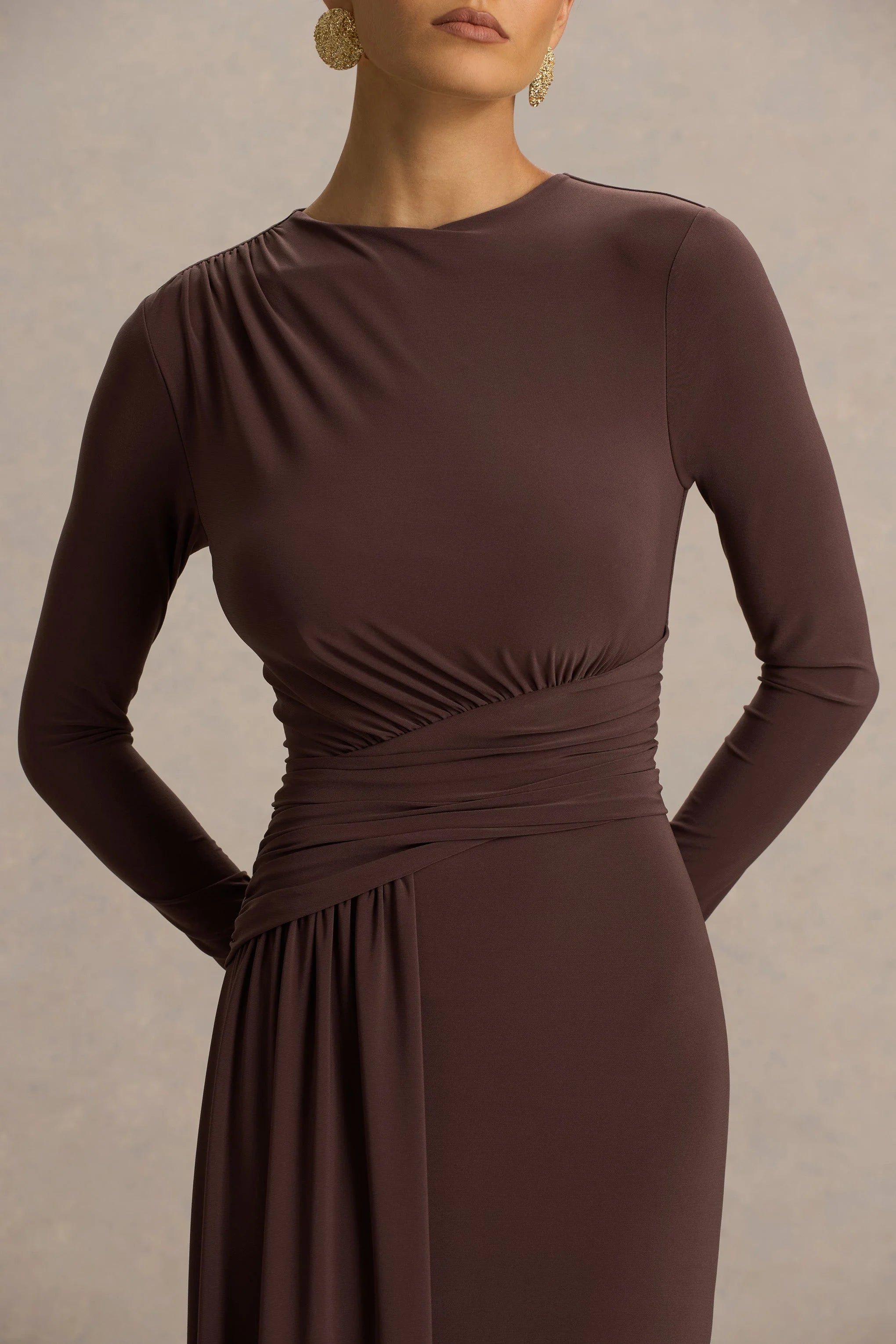 Sophisticated with a sultry twist, Virelle is the ultimate figure-enhancing maxi for statement-making evenings. Crafted from our premium stretch jersey in a deep, brown hue, this design smooths and sculpts the body effortlessly. The classic boat neckline balances the dramatic, asymmetric wrap detail that draws the eye and defines the waist. Finished with flattering ruching and a soft sash that cascades elegantly over the skirt, Virelle is the perfect blend of timeless style and contemporary edge.