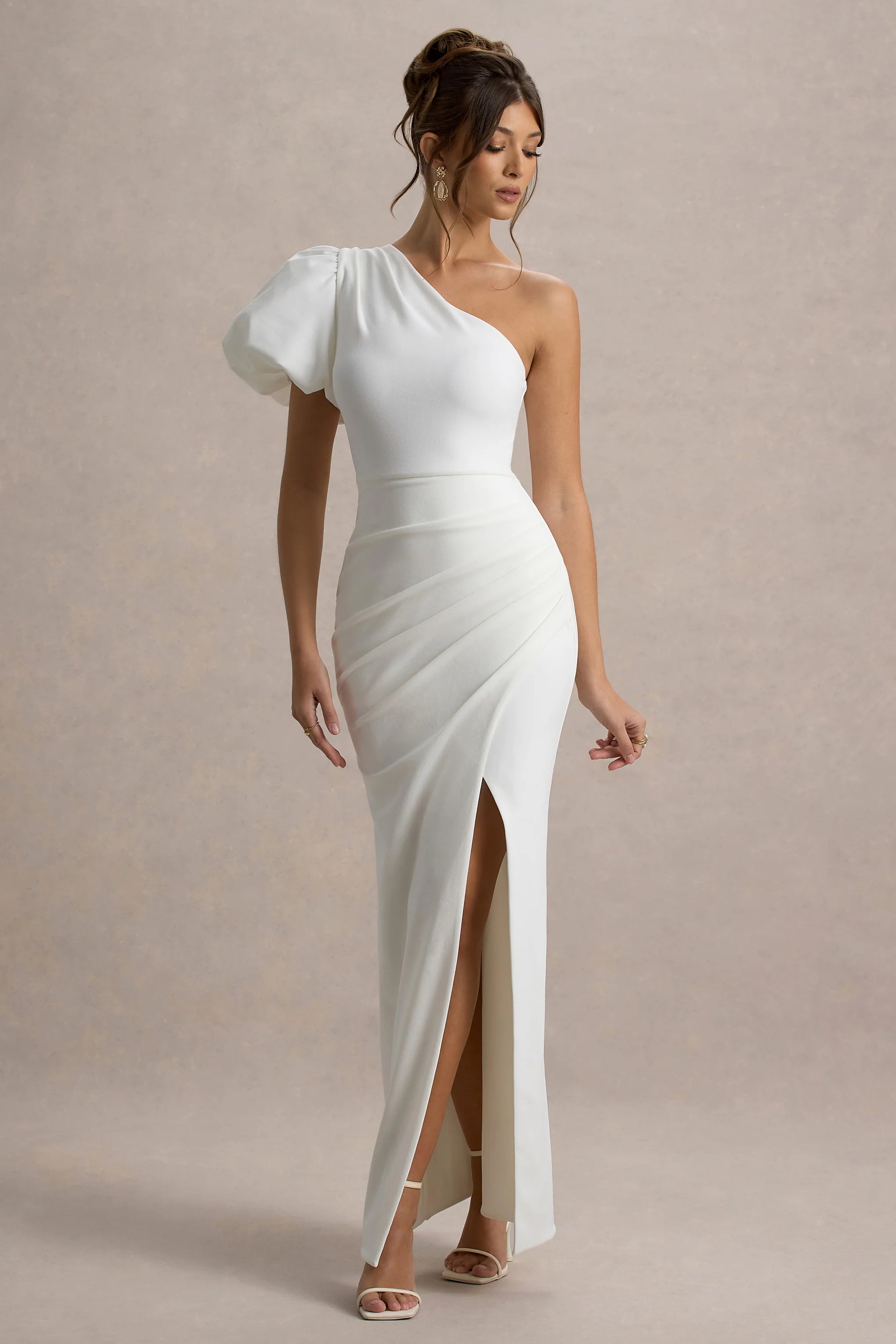 Defined by bold elegance and contemporary flair, Vittoria is a show-stopping choice for your most glamorous occasions. Crafted from our luxurious premium scuba crepe, this white maxi dress features an eye-catching asymmetric neckline paired with a statement puff sleeve, creating a striking silhouette. The fitted bodice flows into a sleek, floor-length skirt, complete with a daring thigh-high split for a touch of allure. Keep Vittoria in the spotlight with stiletto heels for a look that exudes sophistication and confidence.