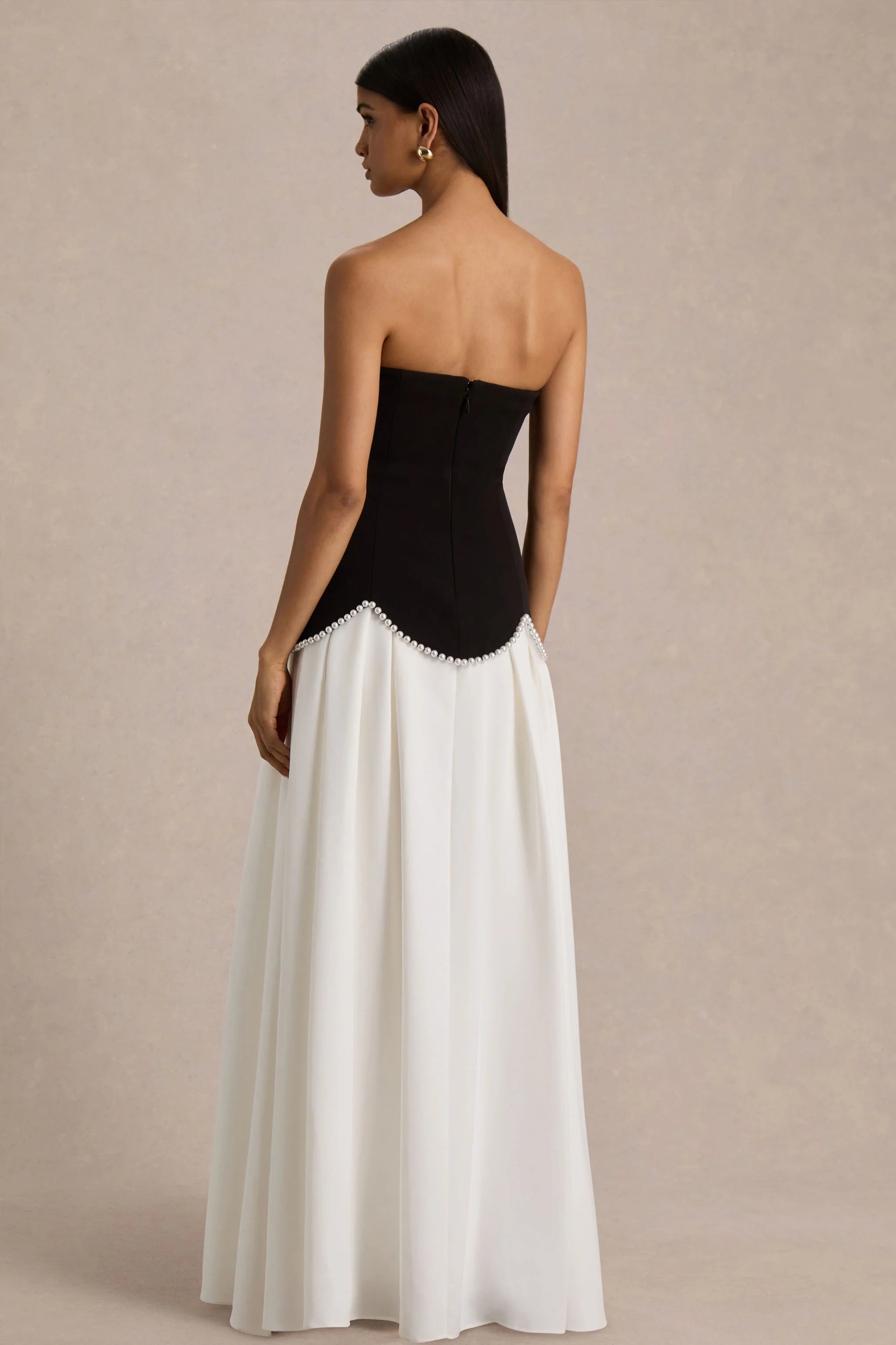 Say hello to Wendy, the maxi dress made for timeless sophistication. Crafted from our premium crepe in contrasting black and white, its floor-length silhouette flatters the figure with effortless grace. The sleek bandeau neckline exudes modern elegance, while scalloped pearl detailing adds a touch of vintage-inspired glamour. Finished with an internal corset, this gown ensures you are flattered from all angles. Wendy is your go-to for a refined take on evening dressing.