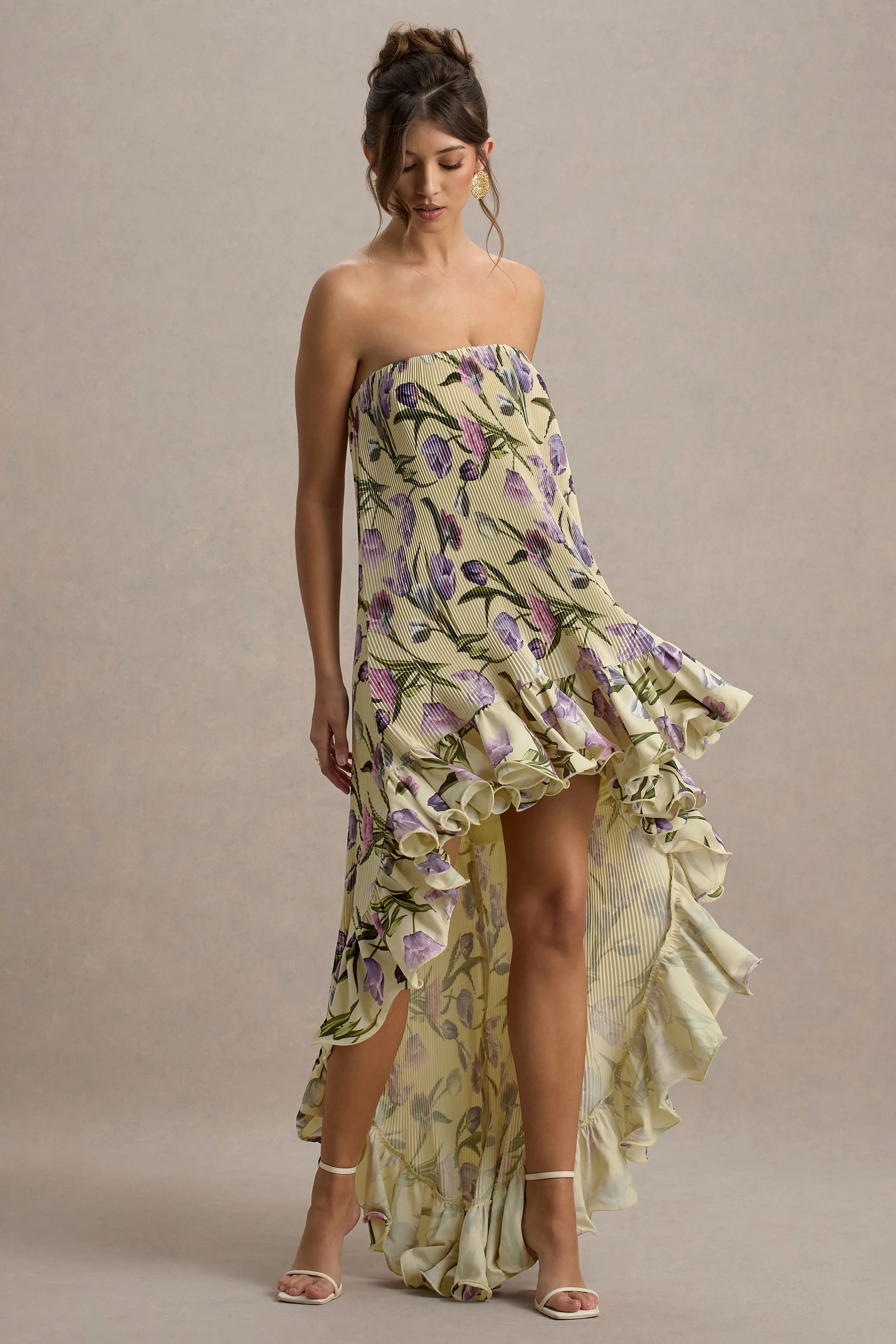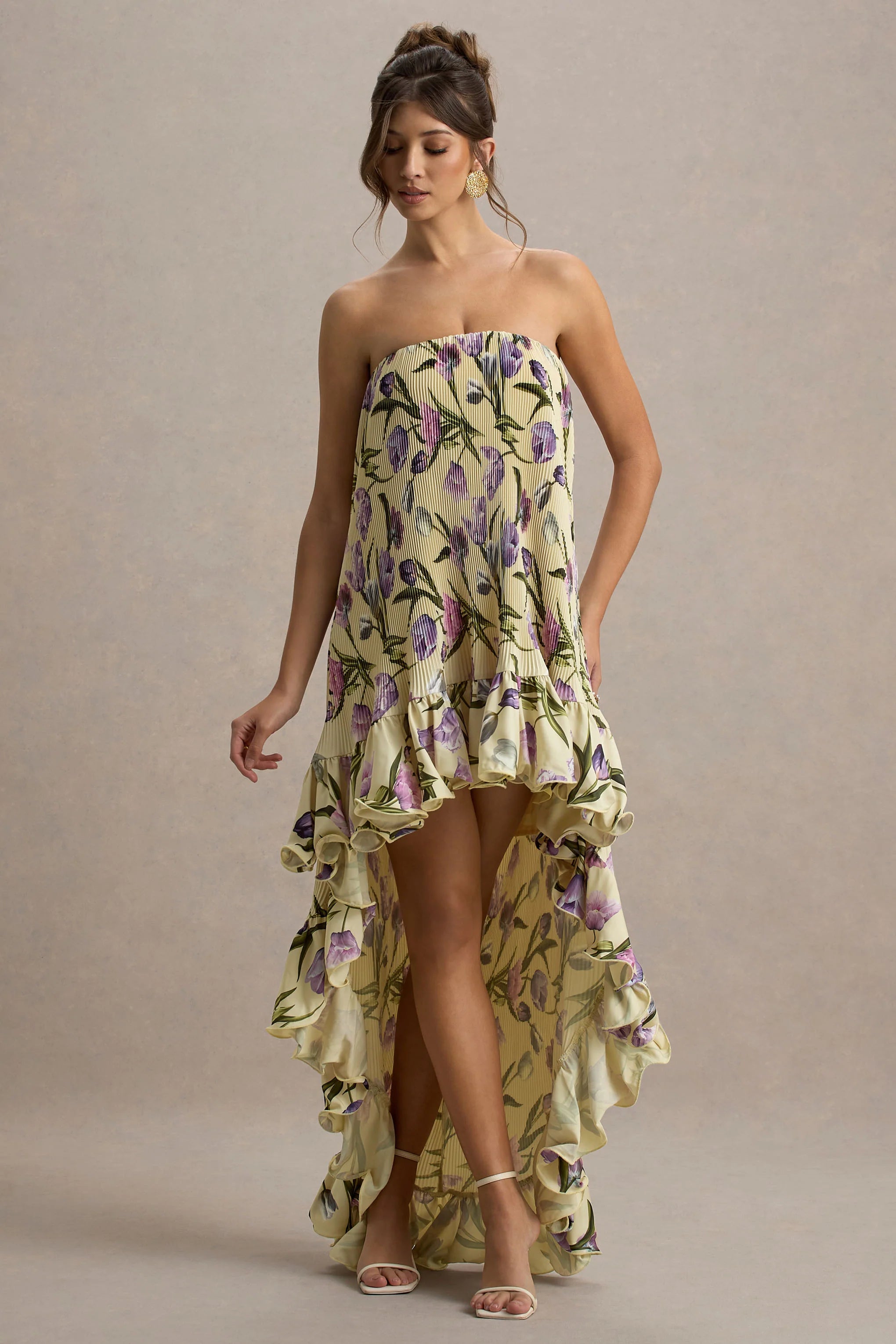 Glamorous and evocative, this ruffled maxi dress is ready to feel that summer swing. Whistler has been crafted in a crisp tulip floral print of our premium pleated chiffon and boasts a bandeau neckline and ethereal high-low hemline. Compliment this strapless piece with a tousled bun this sun season.