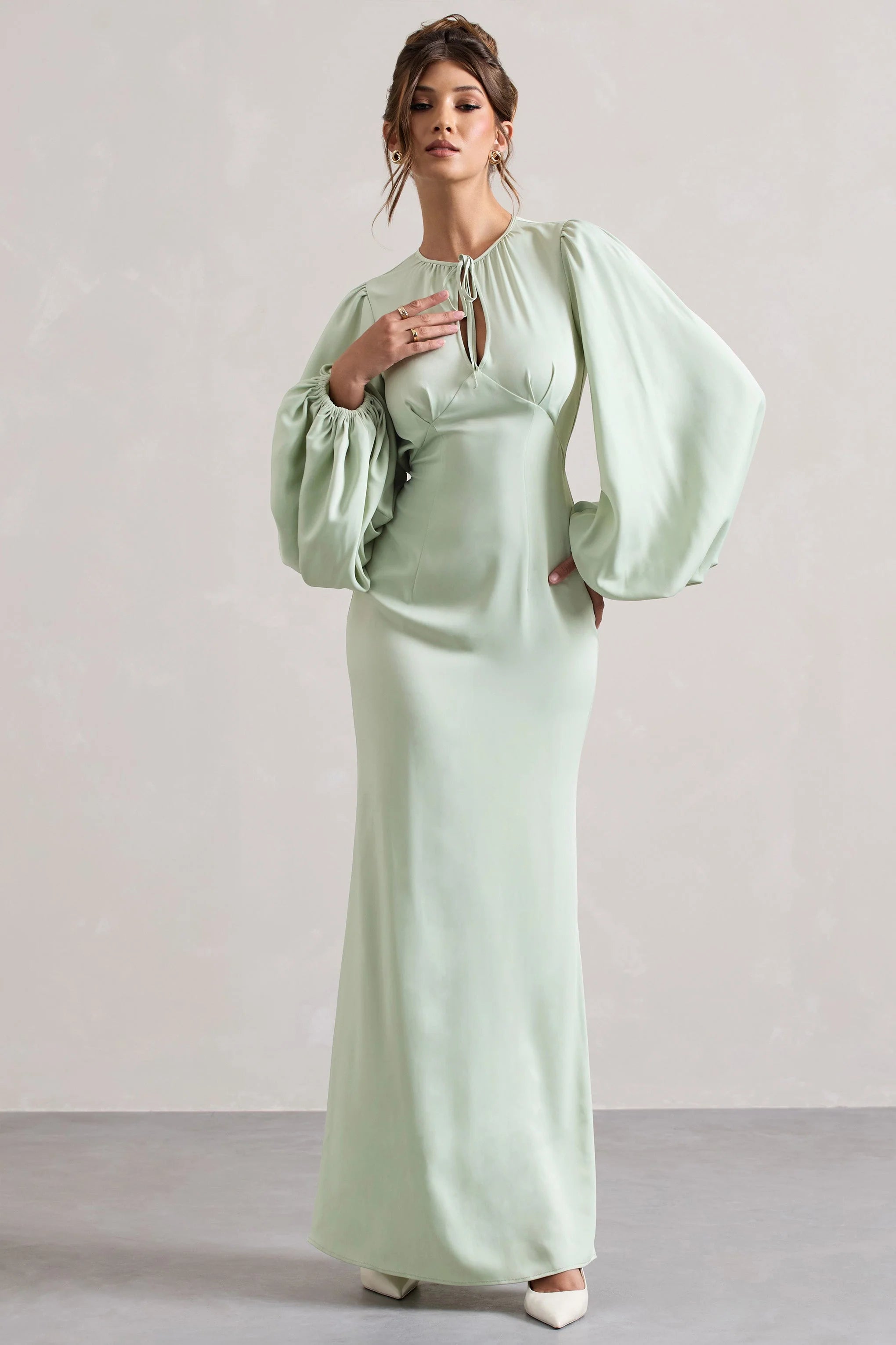 Billowy and ethereal, Wild Rose is the perfect piece for any upcoming summer event on your calendar. Crafted in a light green shade of our premium silky satin, this maxi dress features a self-tie neckline, voluminous sleeves and a contemporary keyhole cut-out. Style yours with a sleek hairstyle at your next occasion to show off all Wild Rose has to offer.