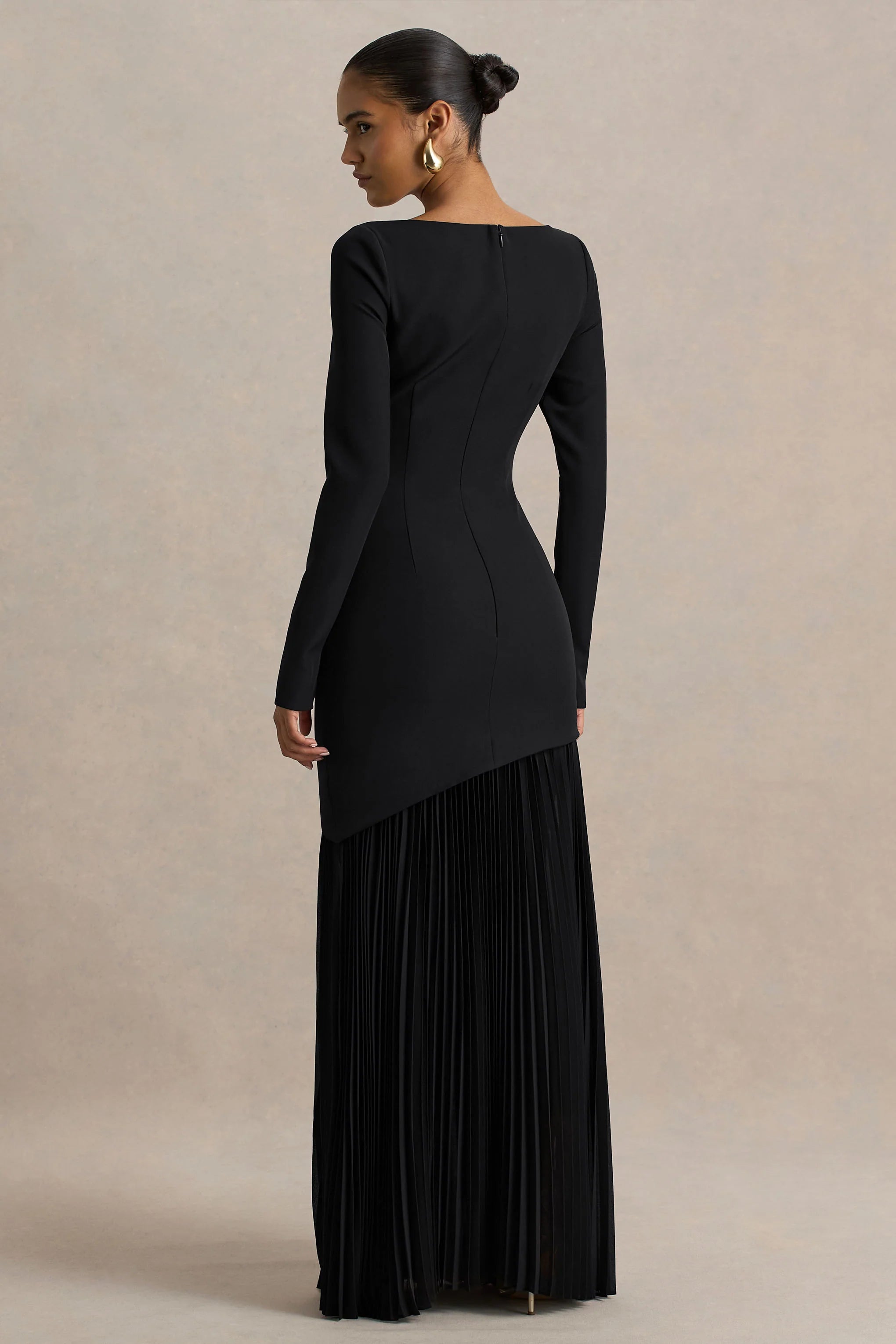Chic and contemporary, Yanira brings an elevated twist to classic occasion wear. Cut from our premium black crepe, this floor-sweeping design features a boat neckline and flattering drop waist that flows into a sheer pleated skirt, adding gorgeous movement and a touch of elegance. This statement silhouette is perfect for black-tie moments or any event that calls for graceful impact.