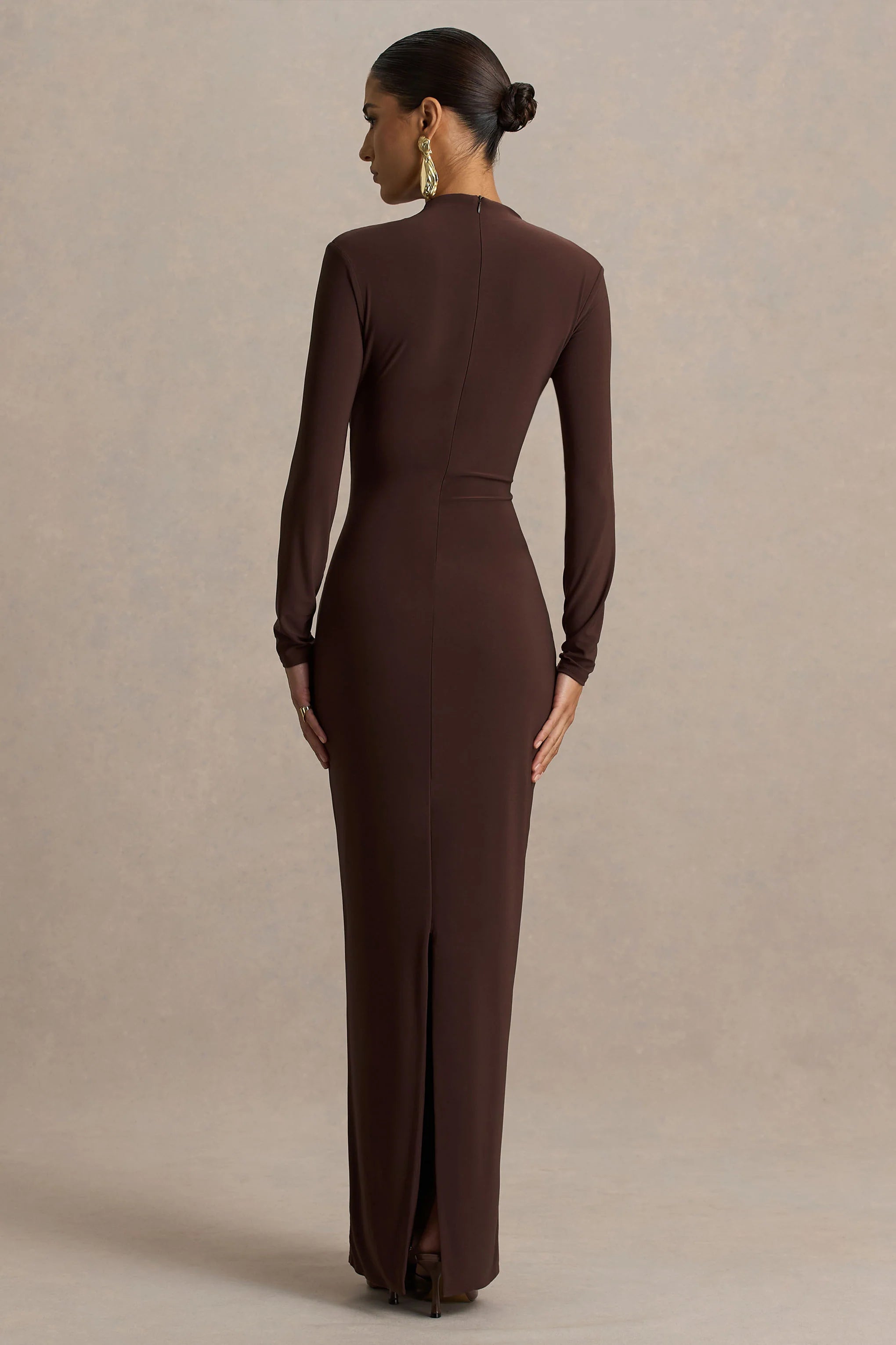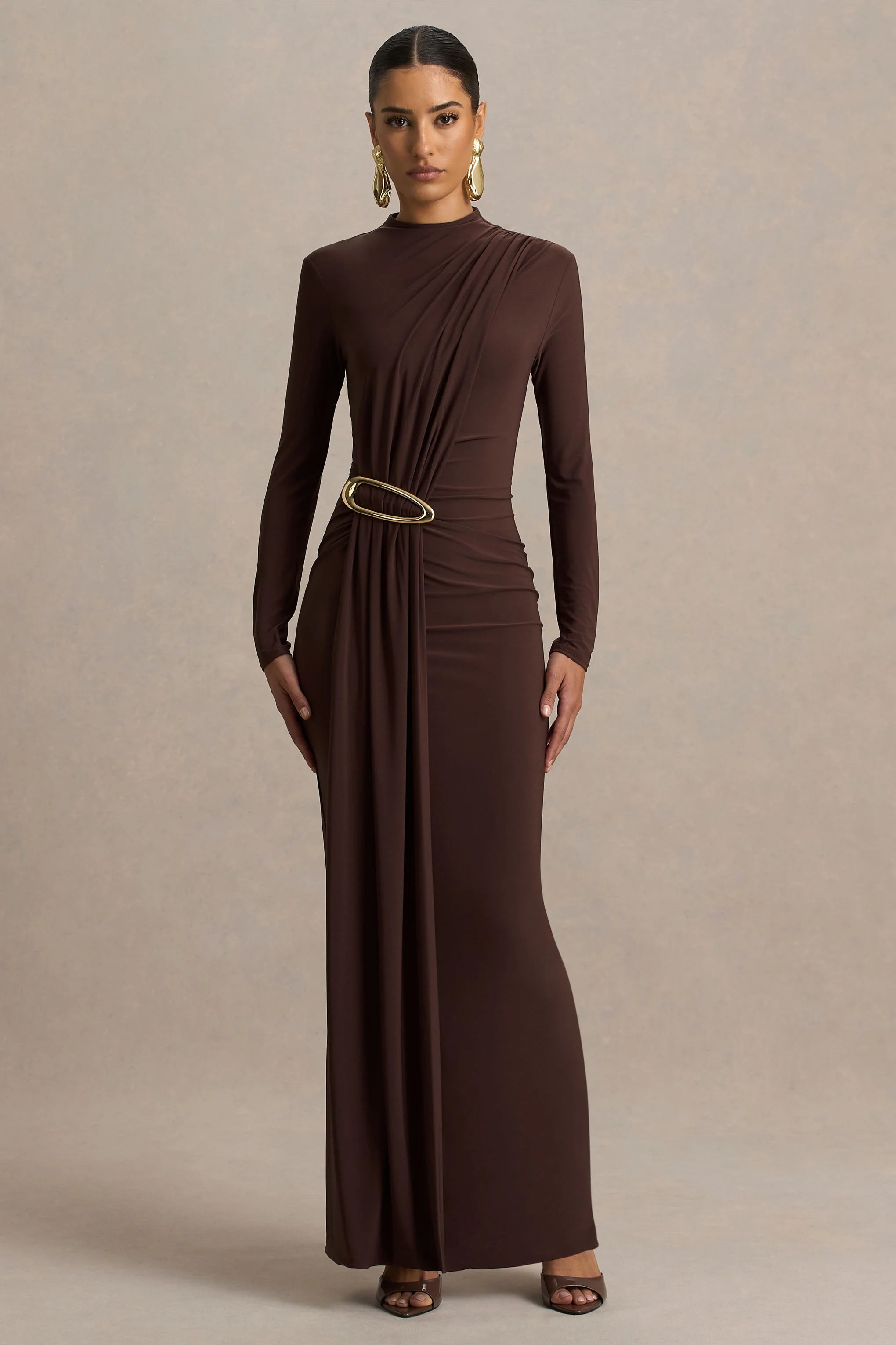 Elevate your wardrobe with the effortlessly chic Zadie. Crafted from our premium stretch jersey, in a warm brown hue, this maxi is designed to flatter your curves from every angle . The high neckline and subtle gathered detailing create an elegant, modern silhouette, while the gold hardware at the waist adds a hint of glamour. Perfect for cocktails, dinners, or any occasion where you want to make a statement.