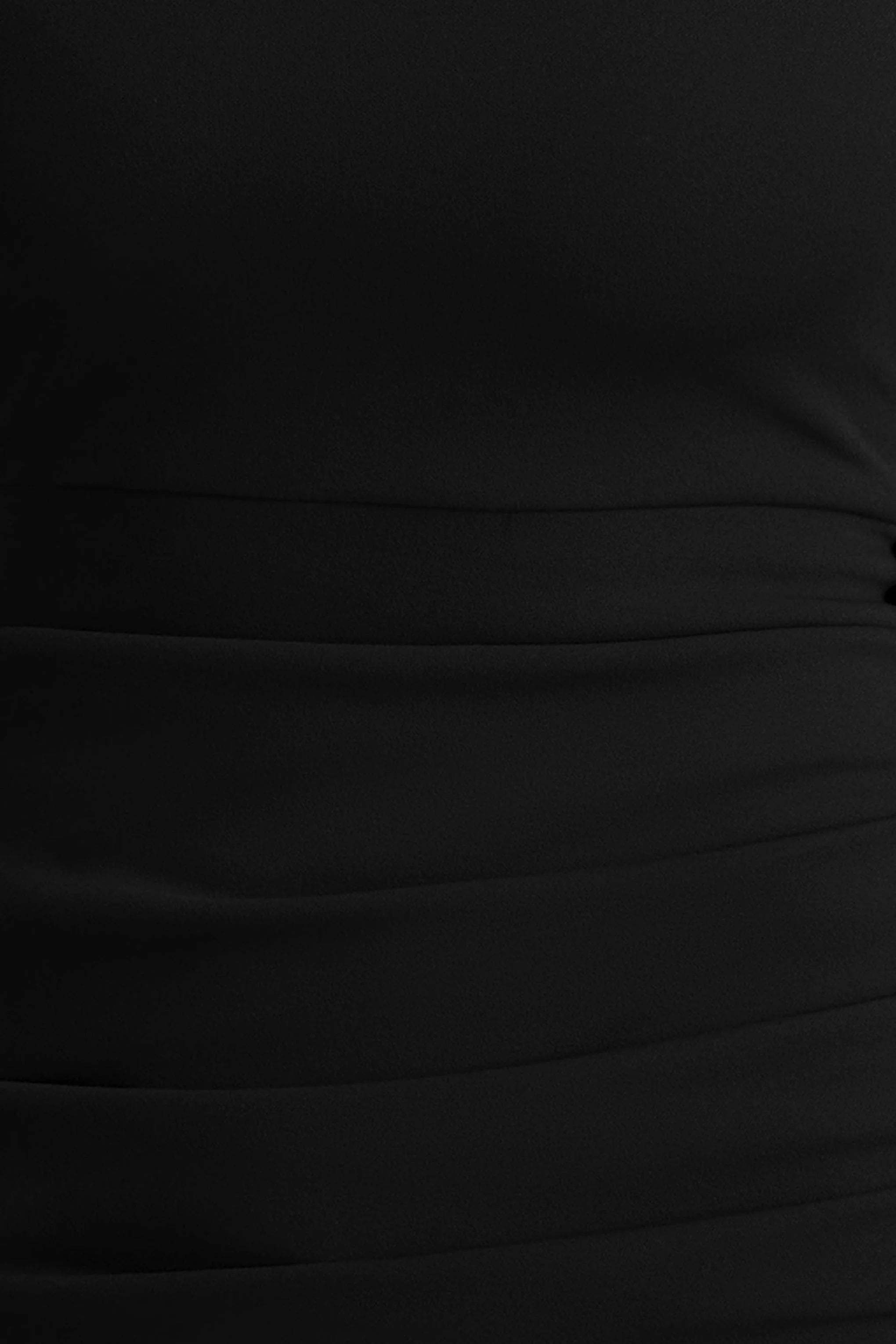 Meet the ultimate fusion of elegance and drama for you to make a bold statement in, Zaya. Created in our premium scuba crepe in a dreamy black hue, this sculpting mini dress is designed to contour your curves while exuding sophistication. The crew neckline and structured shoulder pads create a powerful tailored silhouette, which is contrasted with the standout sash detail cascading from the skirt effortlessly to the floor. Creating the most show stopping finish which is perfect for glam occasions.