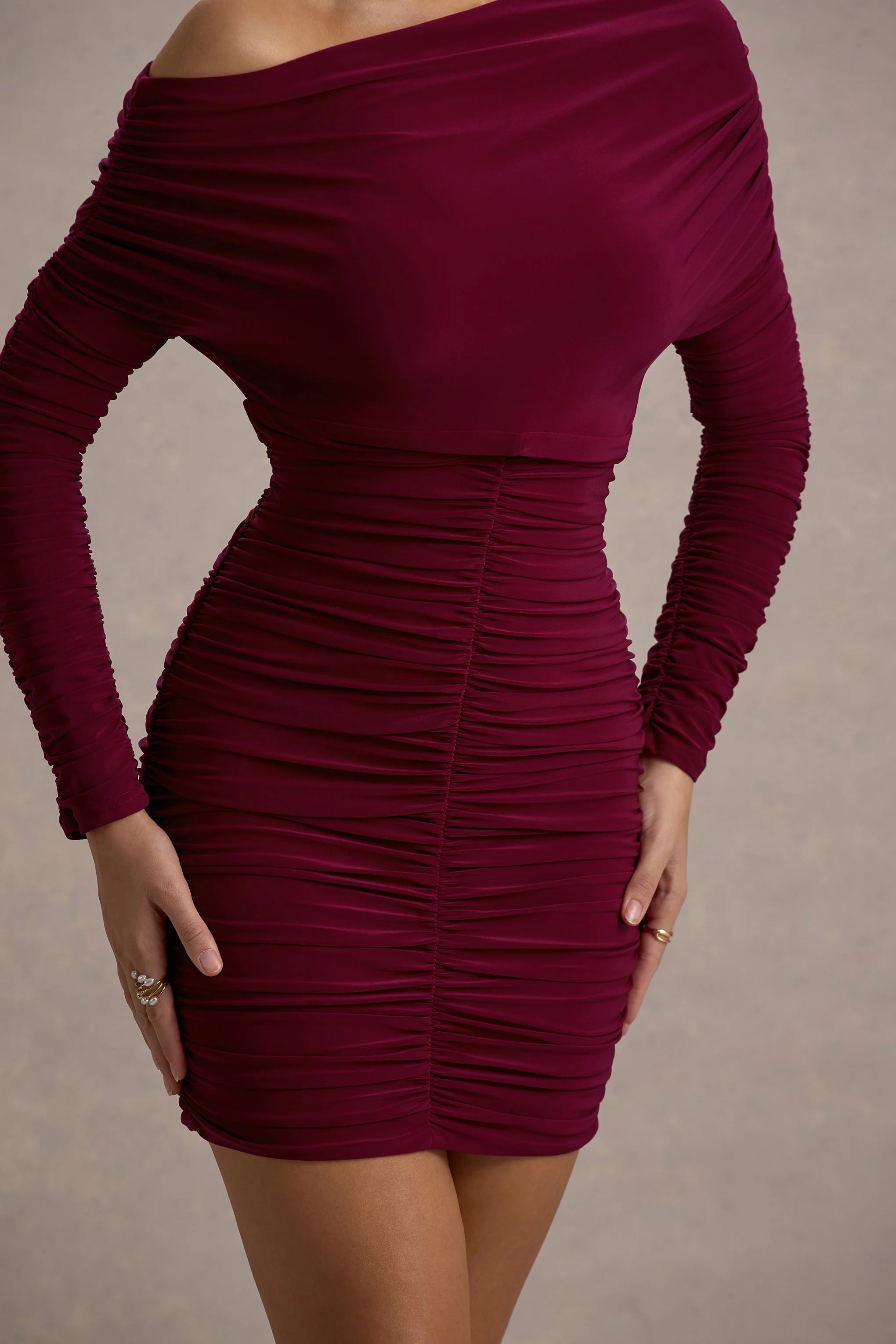 A stand-out staple, every wardrobe needs a mini like Zhara. Expertly crafted in a curve-enhancing bodycon silhouette of our premium jersey, this burgundy showstopper is defined by an asymmetric neckline, long sleeves and full body ruching. Elevate yours with some bouncy curls and strappy stilettos for the ultimate girls night ensemble.