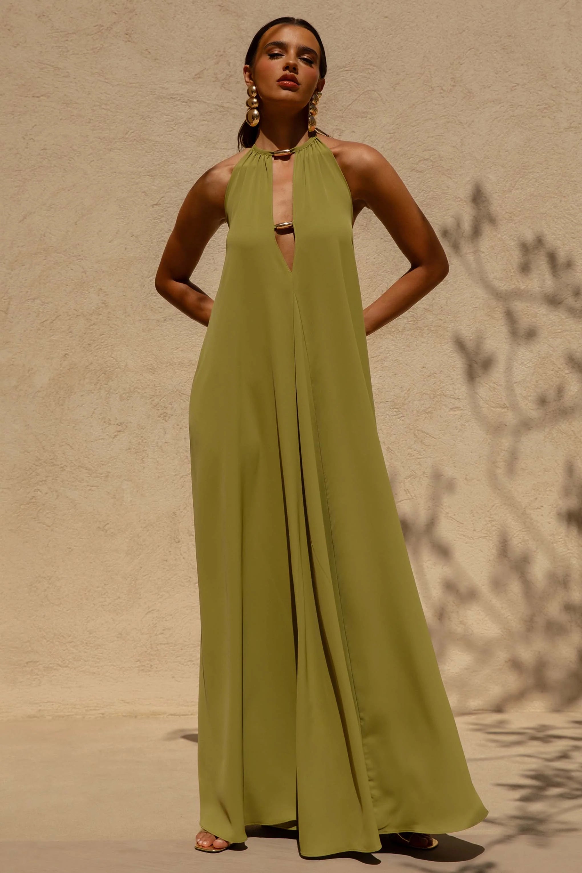 Step into effortless elegance with Zyon, a bold blend of sophistication and allure. Designed in a striking green hue from premium light woven fabric, this floor-sweeping maxi silhouette exudes effortless elegance. Framed by a high neckline with a chic self-tie, this look is elevated with a daring chest cut-out and finished with luxe gold bead detailing for a touch of opulence. Style with gold accessories to tie the look together.